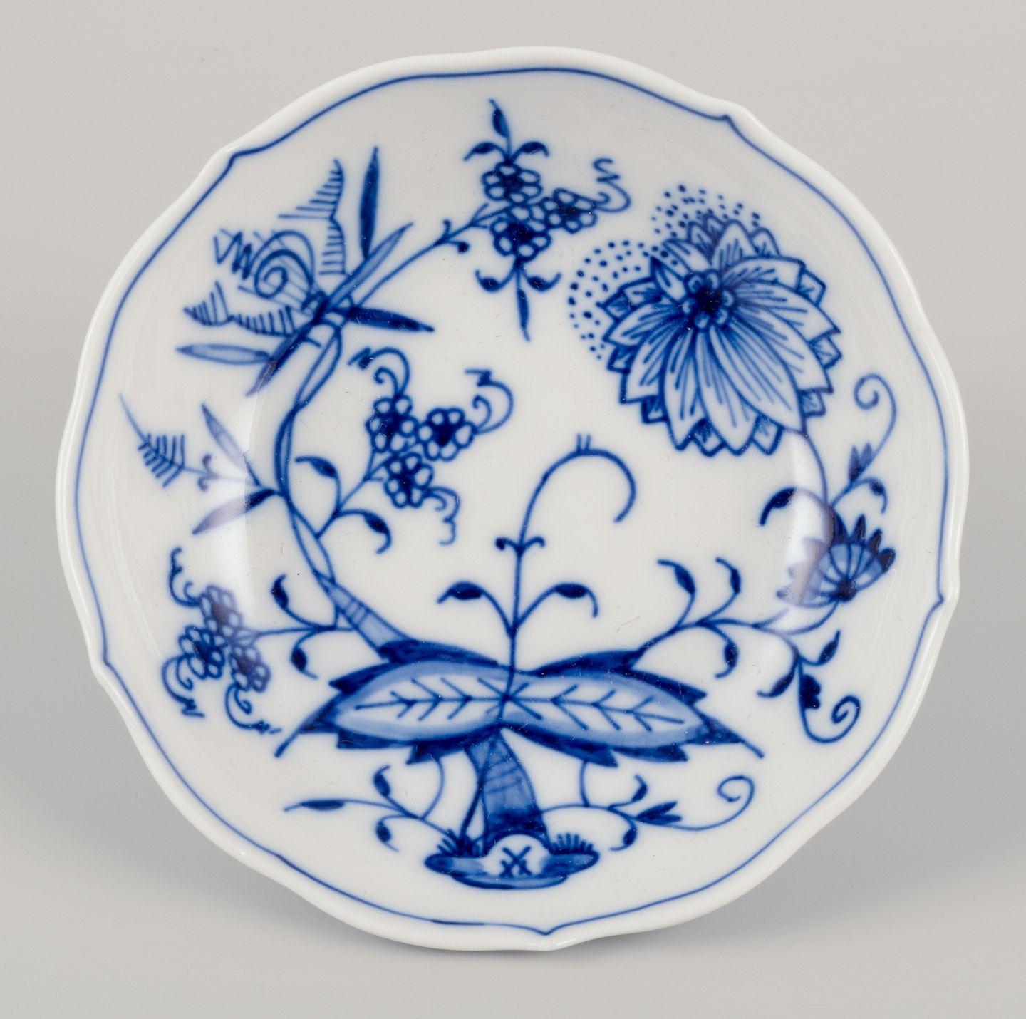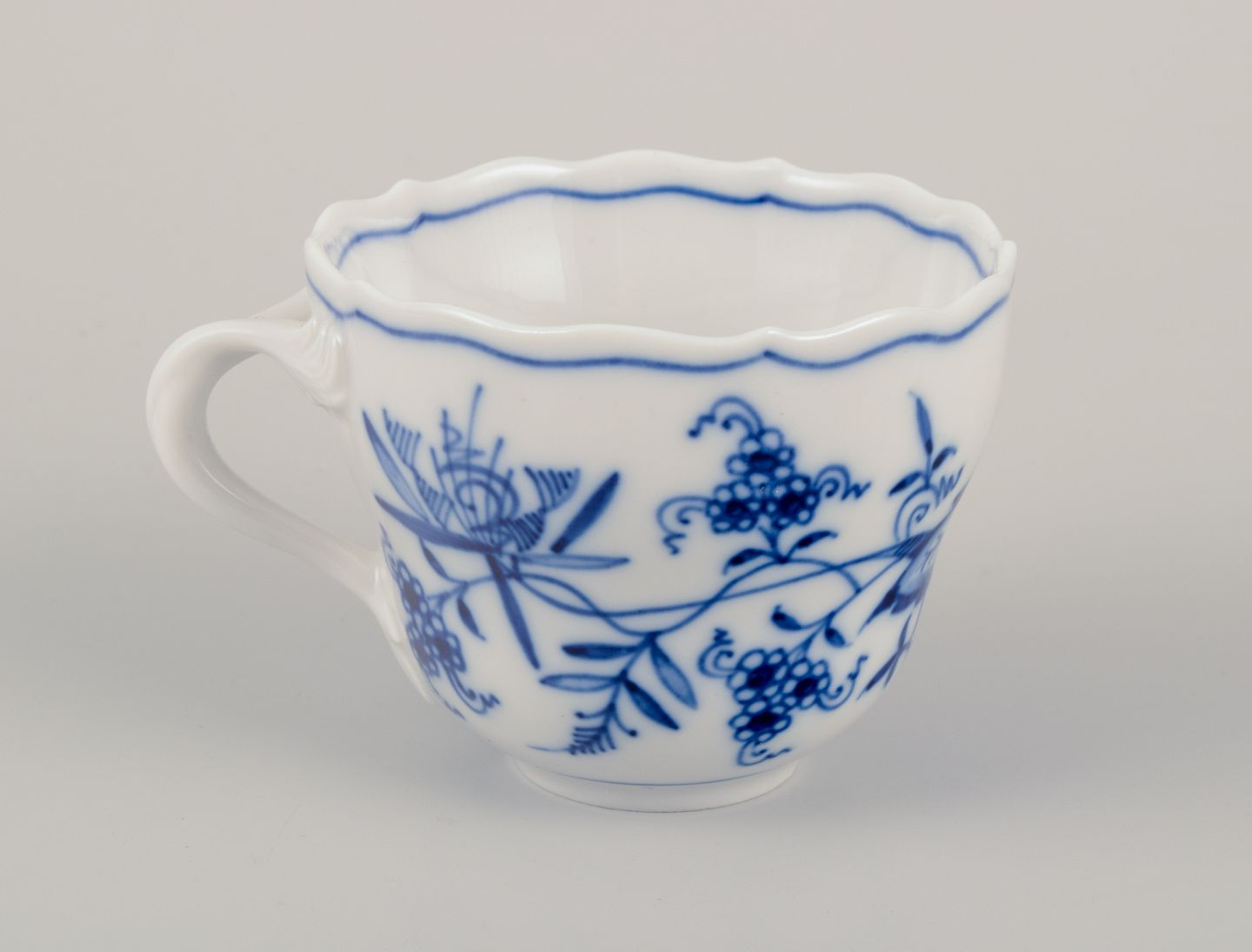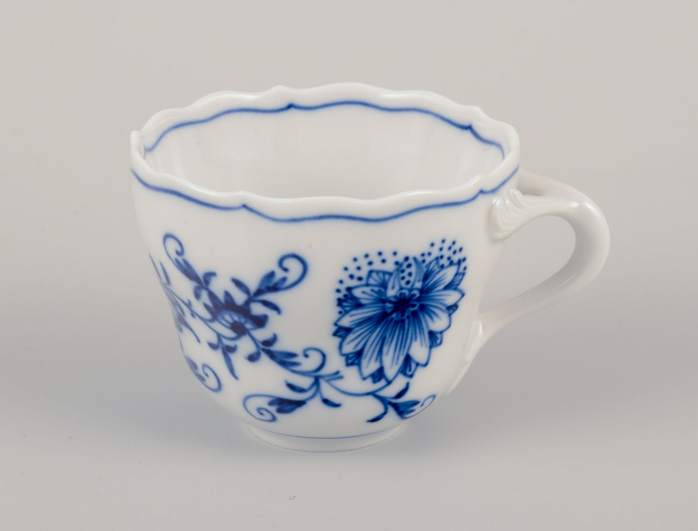 Et sæt på seks Løgmønstret mokkakopper med tilhørende underkopper. Håndmalet.
