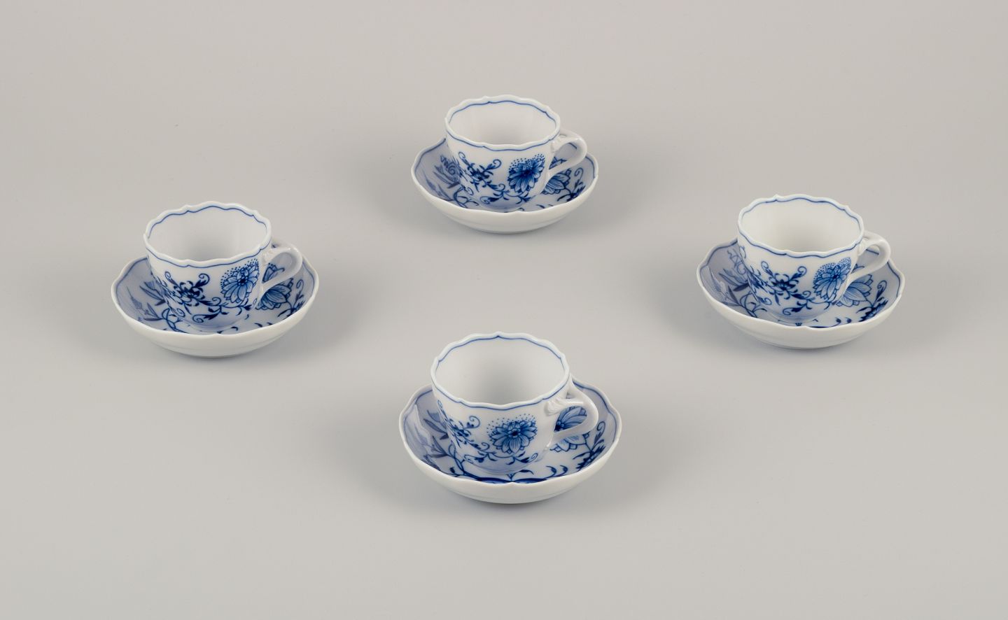 Et sæt på fire Løgmønstret mokkakopper med tilhørende underkopper.