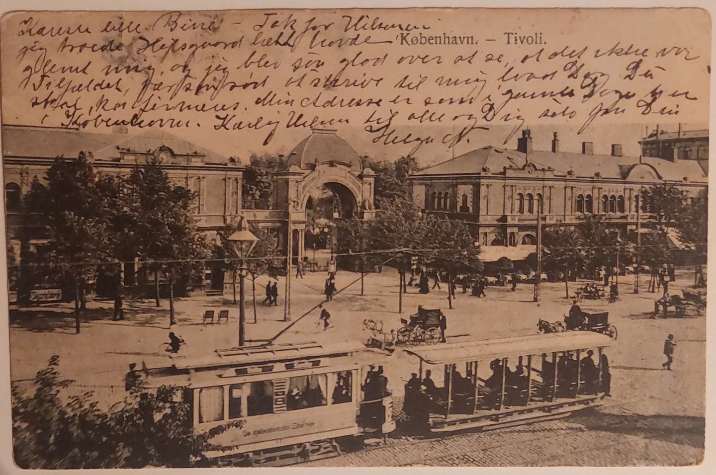 Postkort: Sporvogn foran indgangen til Tivoli i 1904