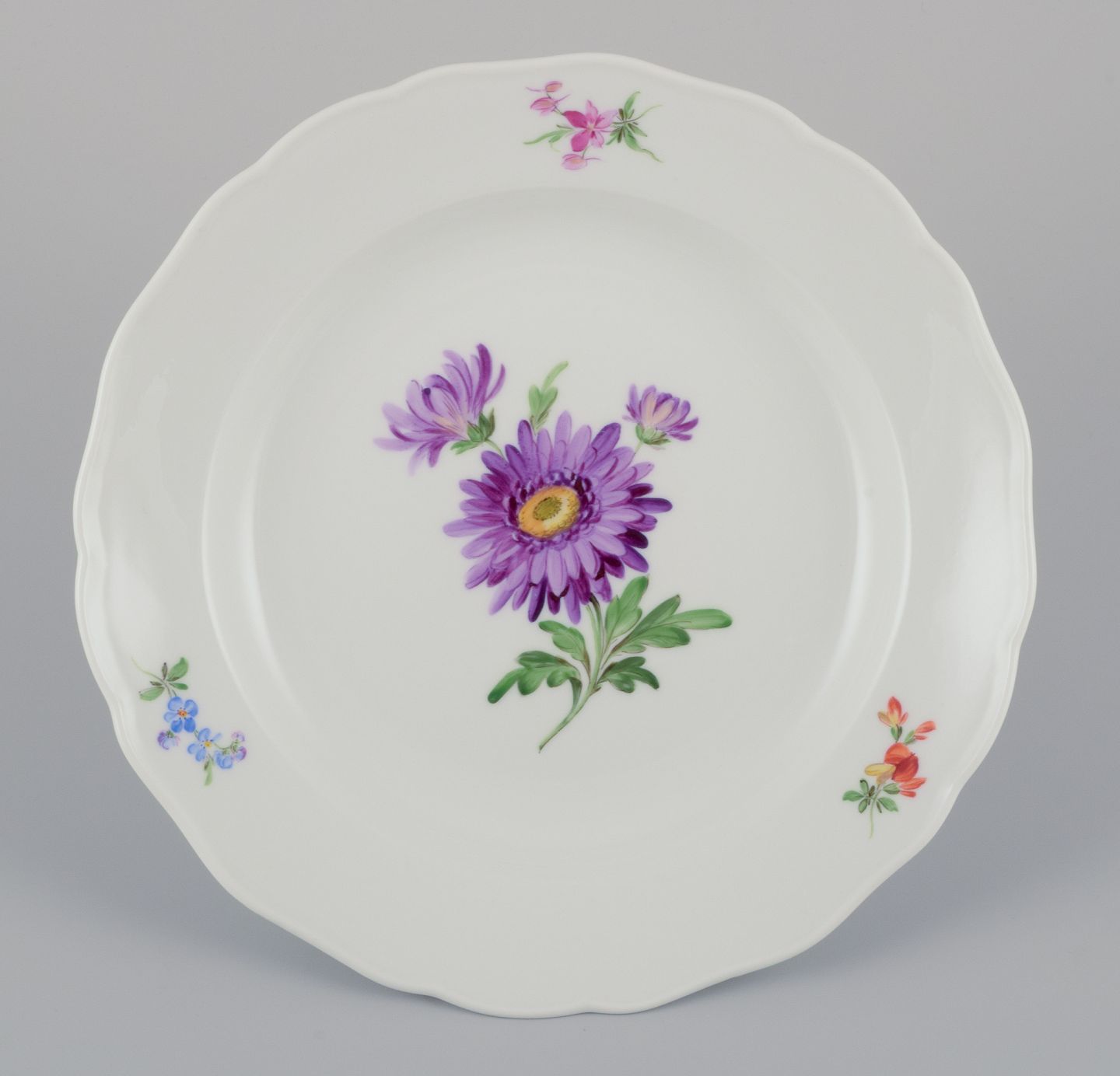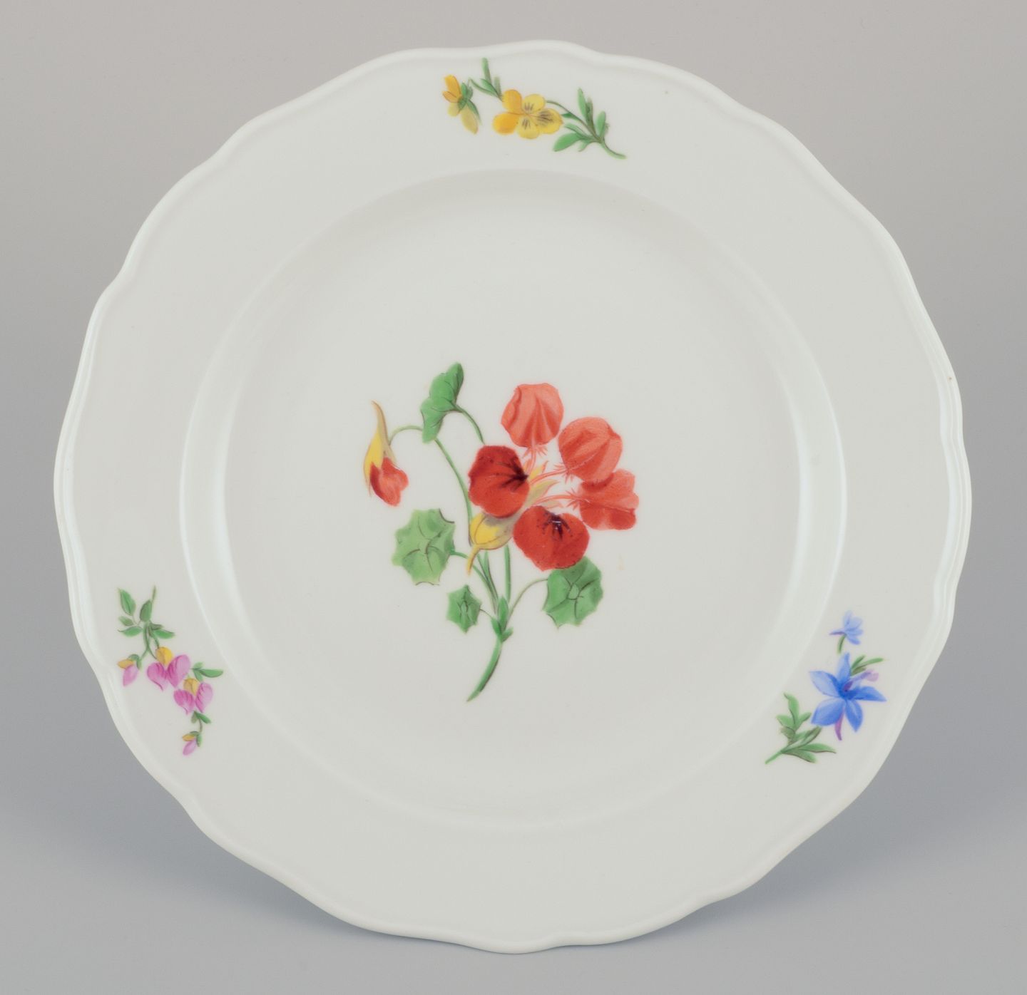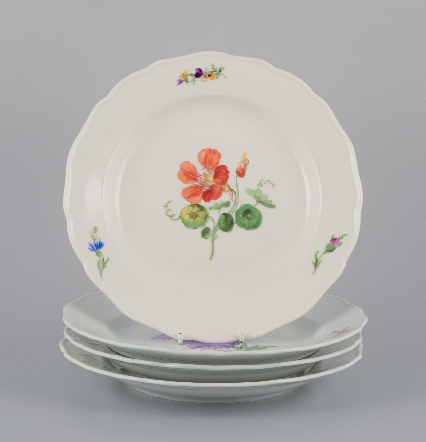 A set of four dinner plates. Hand-painted with different floral motifs.
