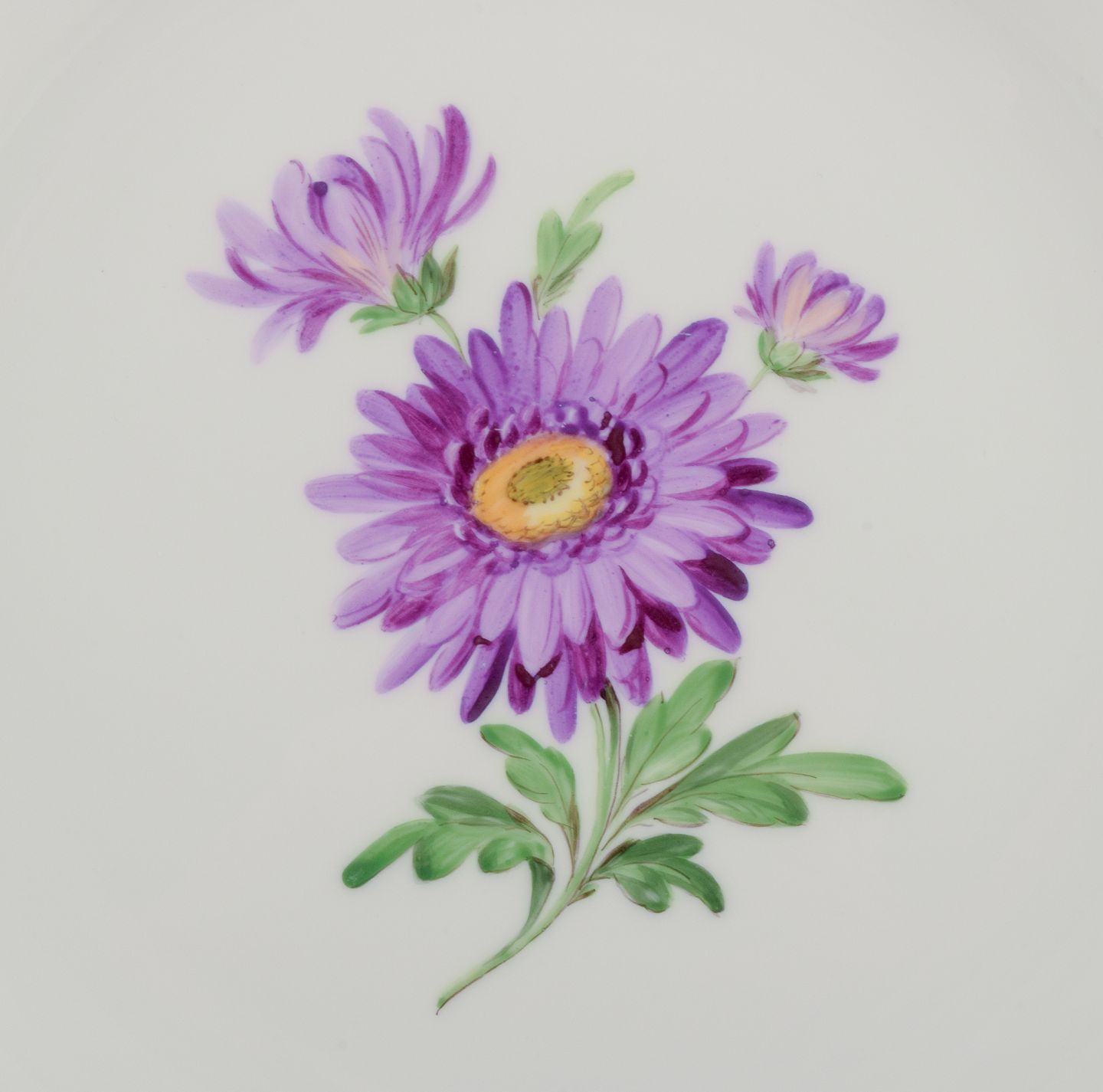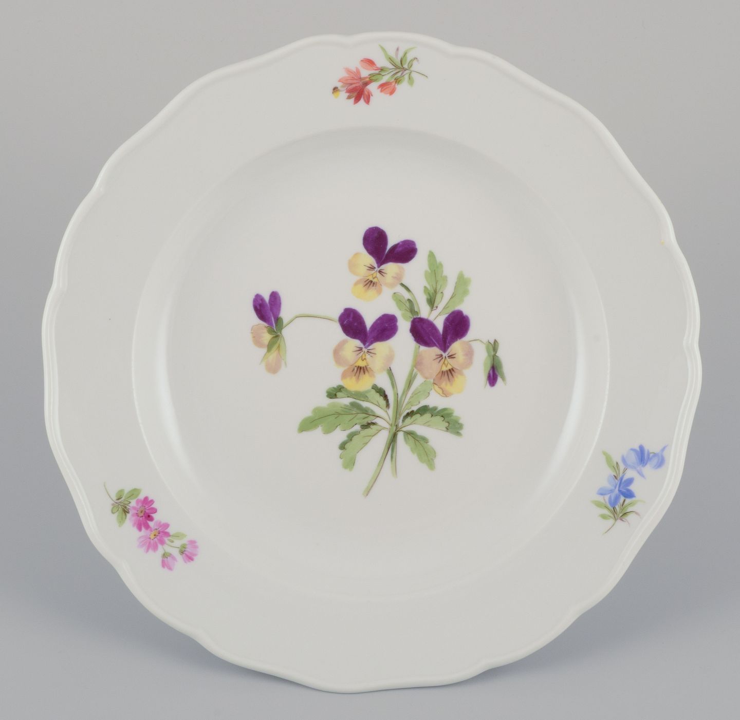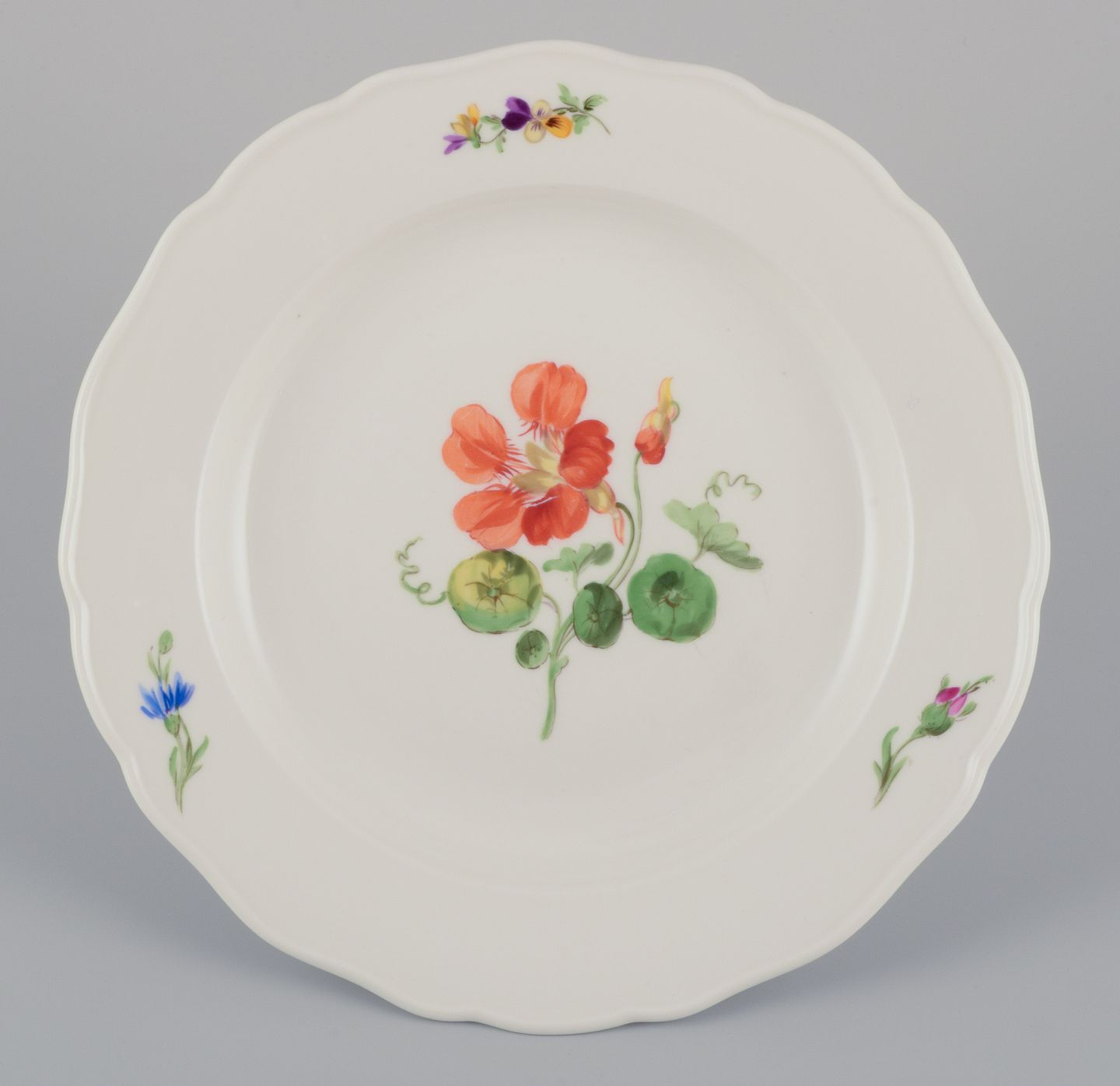 A set of four dinner plates. Hand-painted with different floral motifs.