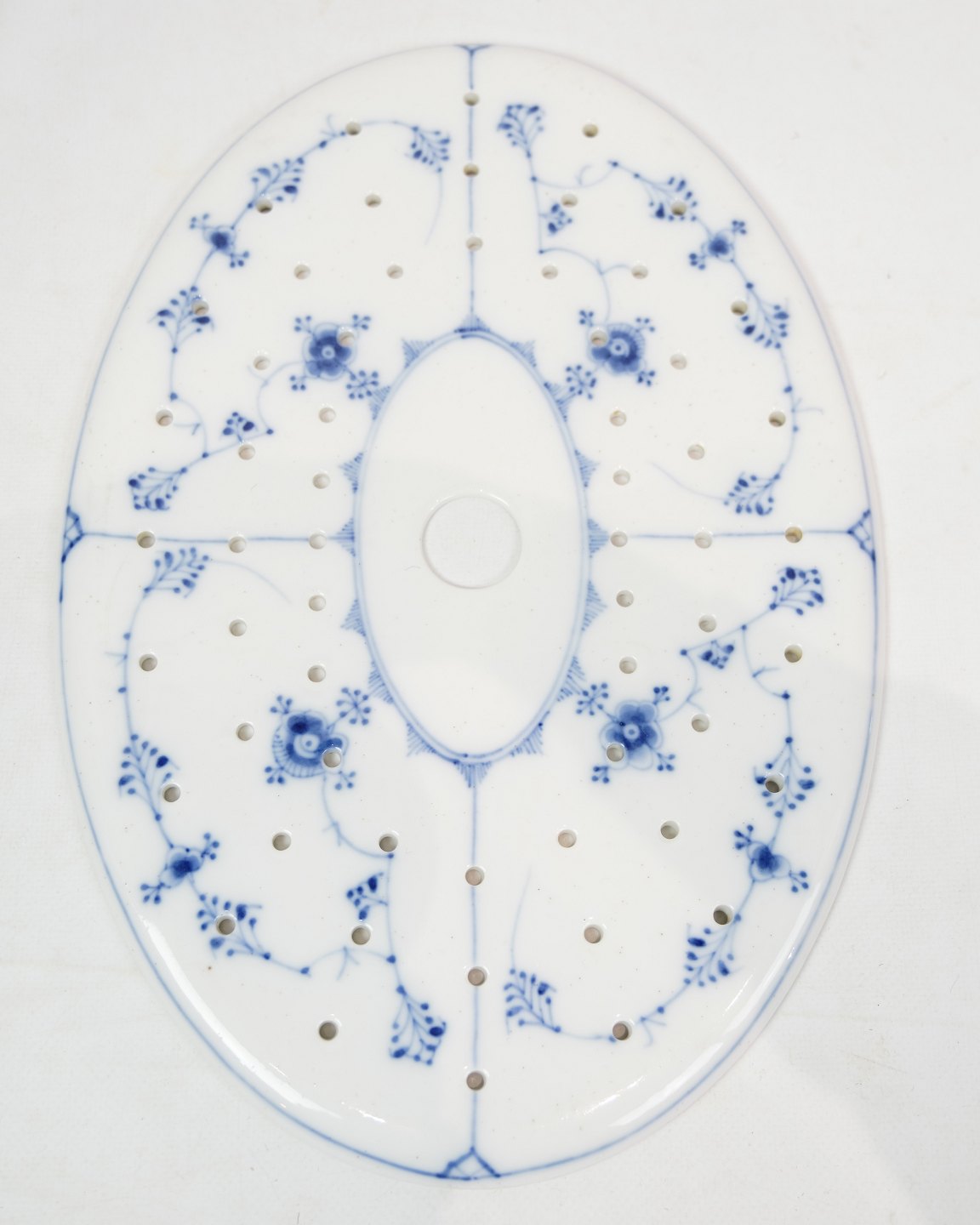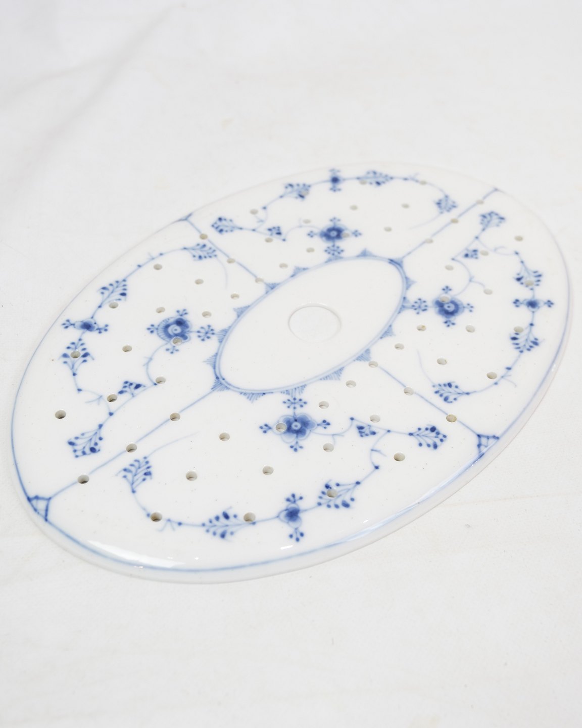 Det ovale Royal Copenhagen Musselmalet løse fiskerist til fiskefadet (Dekorationsnummer 1/110) er en smuk og funktionel tilføjelse til dit porcelænssæt. Dette løse fiskeri er designet specielt til at supplere fiskefadet og tilføjer et unikt og dekorativt touch til din borddækning.