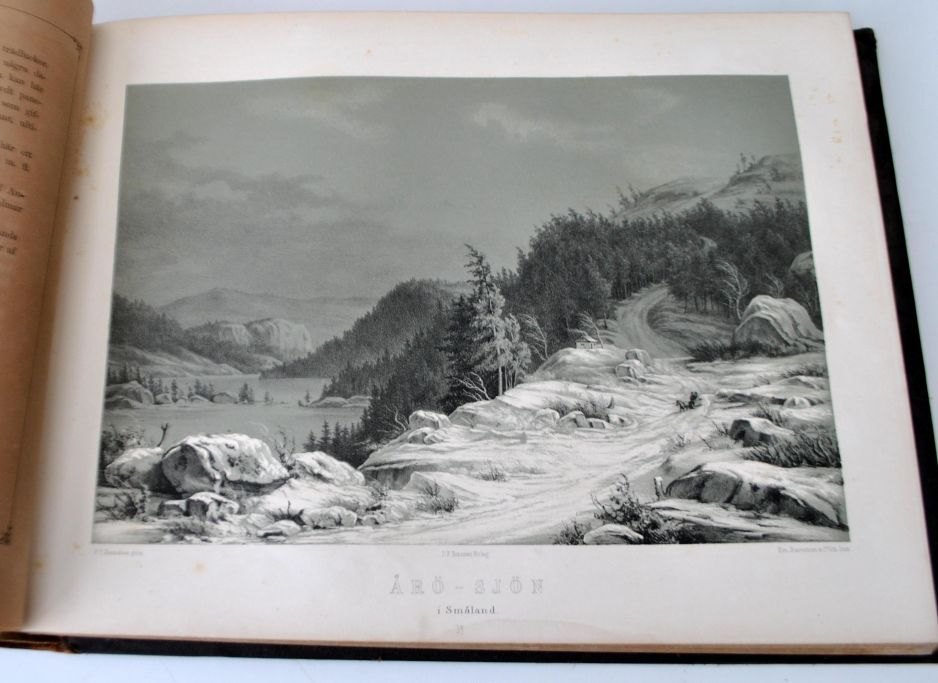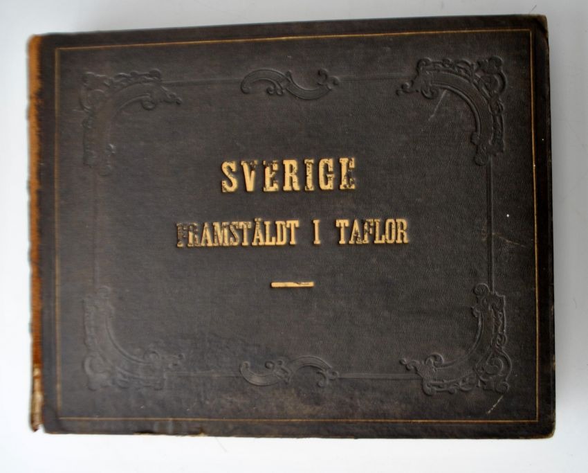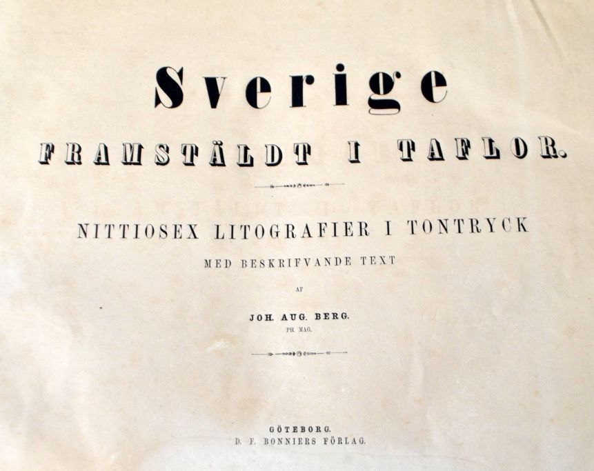 Sverige Framstäldt i taflor - Nittiosex litografier i tontryck med beskrifvande text af Joh. Aug. Berg. Trykt hos Hedlund og Lindskog. Udgivet af D. F. Bonniers Förlag, Göteborg, Sverige. 1856. Med 96 litografier af svenske byer, slotte og naturområder. Forrest indholdsfortegnelse. Indbundet. 194 sider. H: 28 cm L: 37 cm