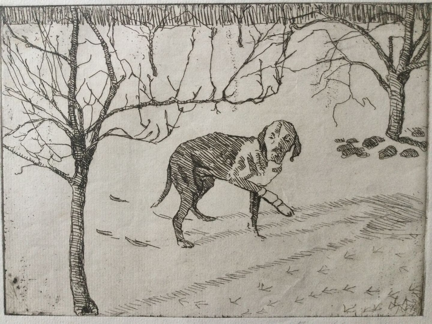 Radering af Christian Juel-Madsen - Hund i sneen.