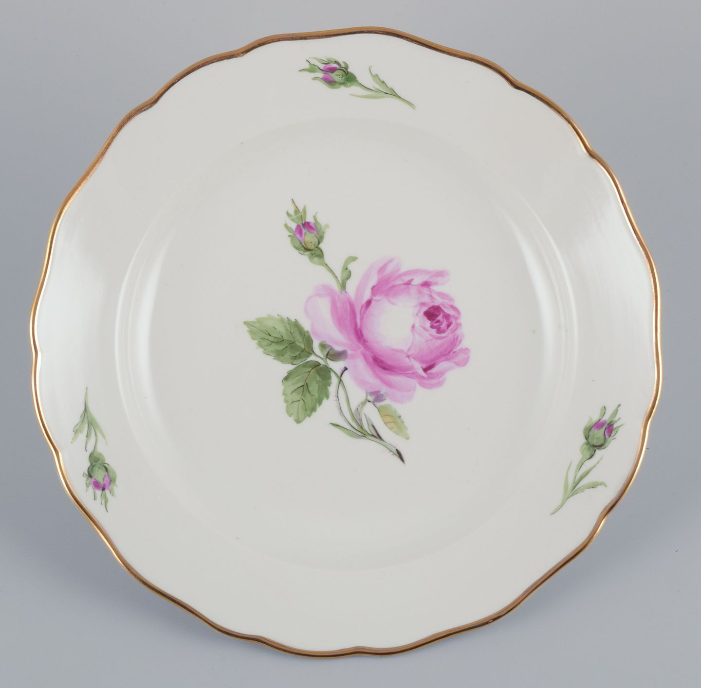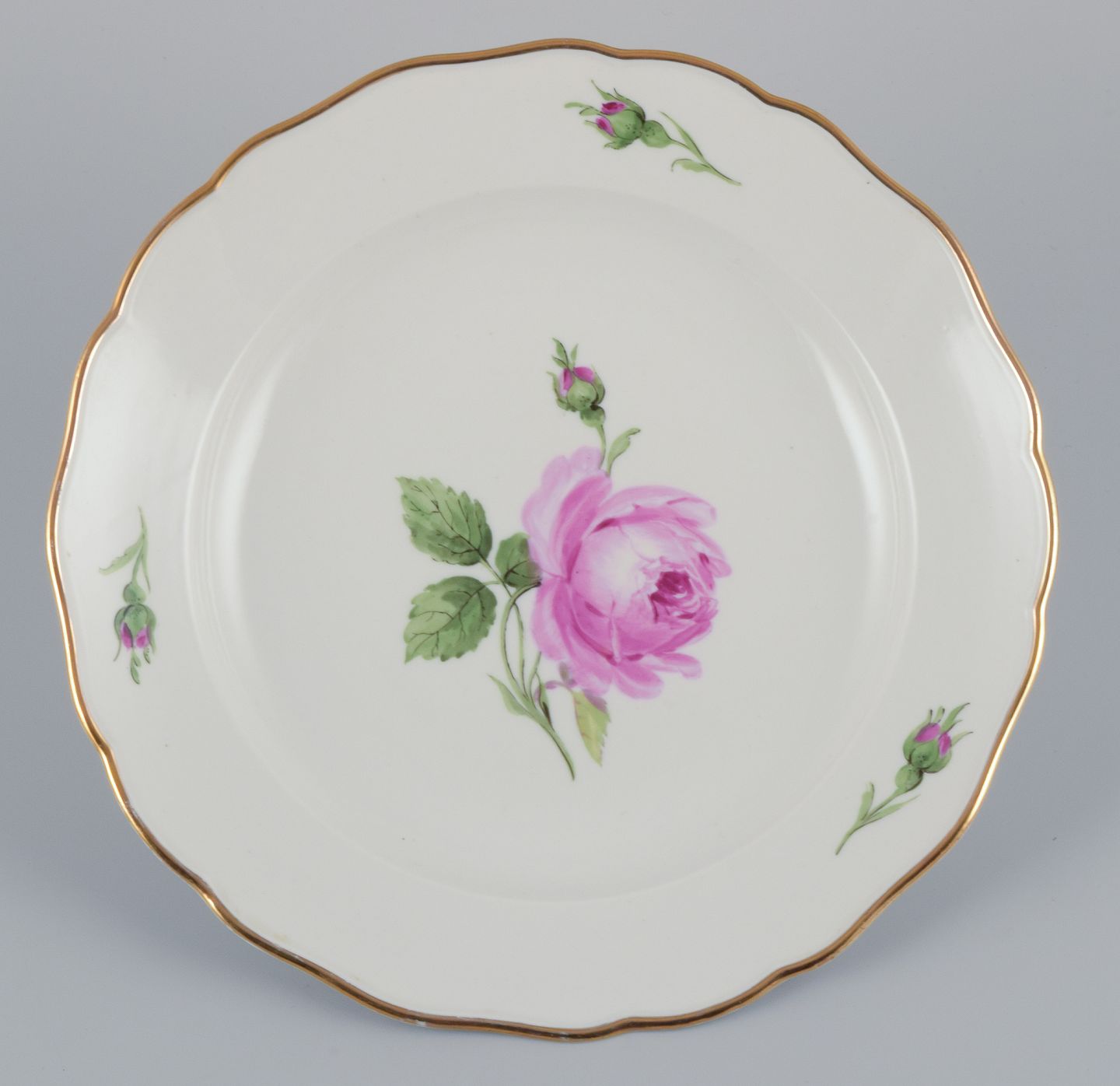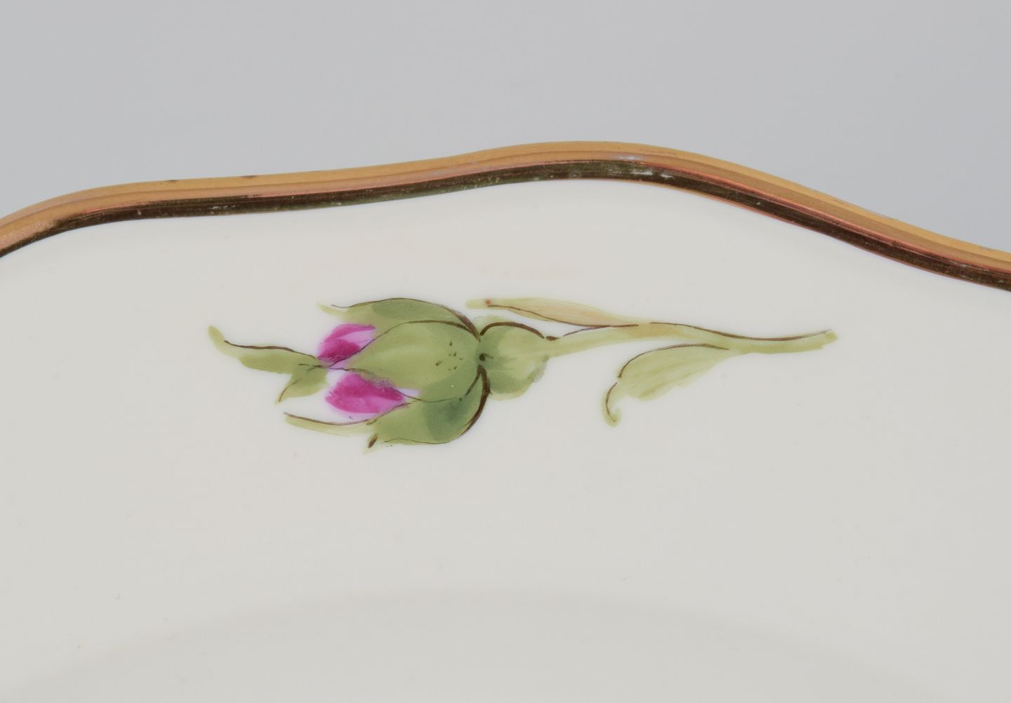 Håndmalet med lyserøde roser, guldkant.