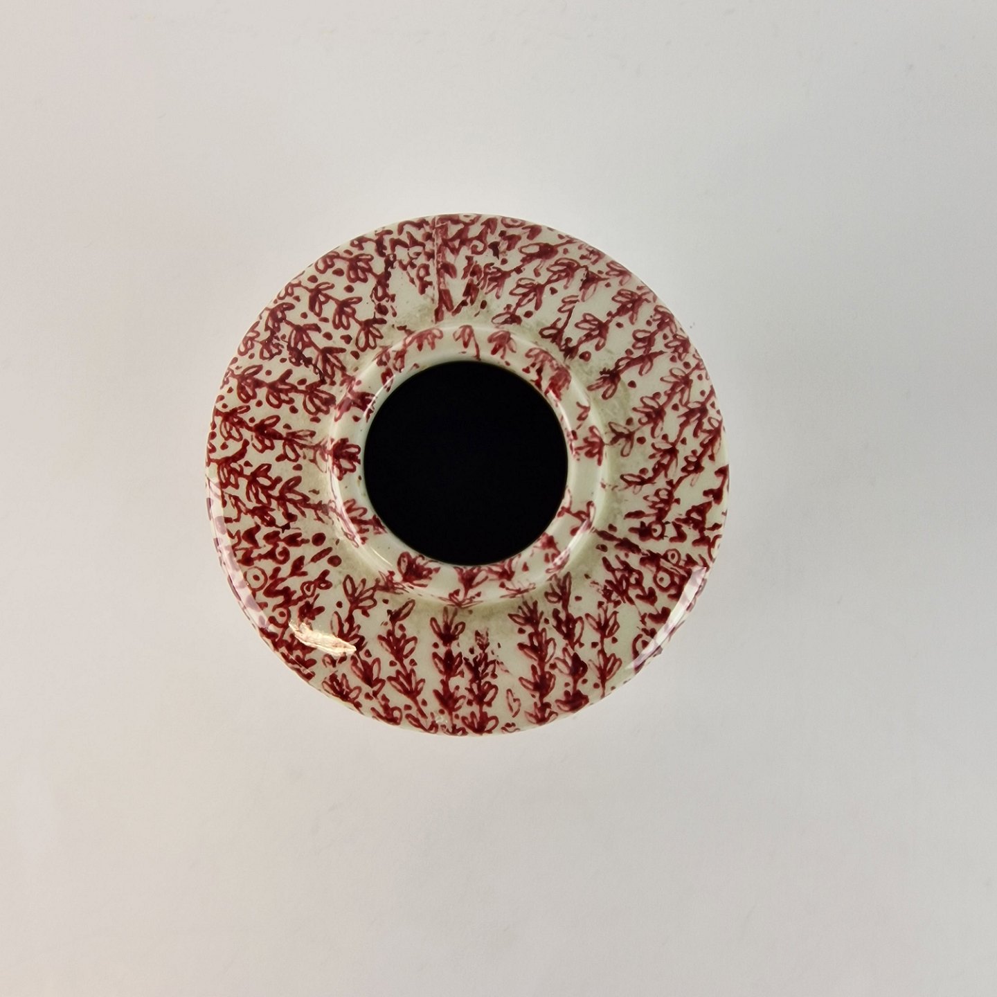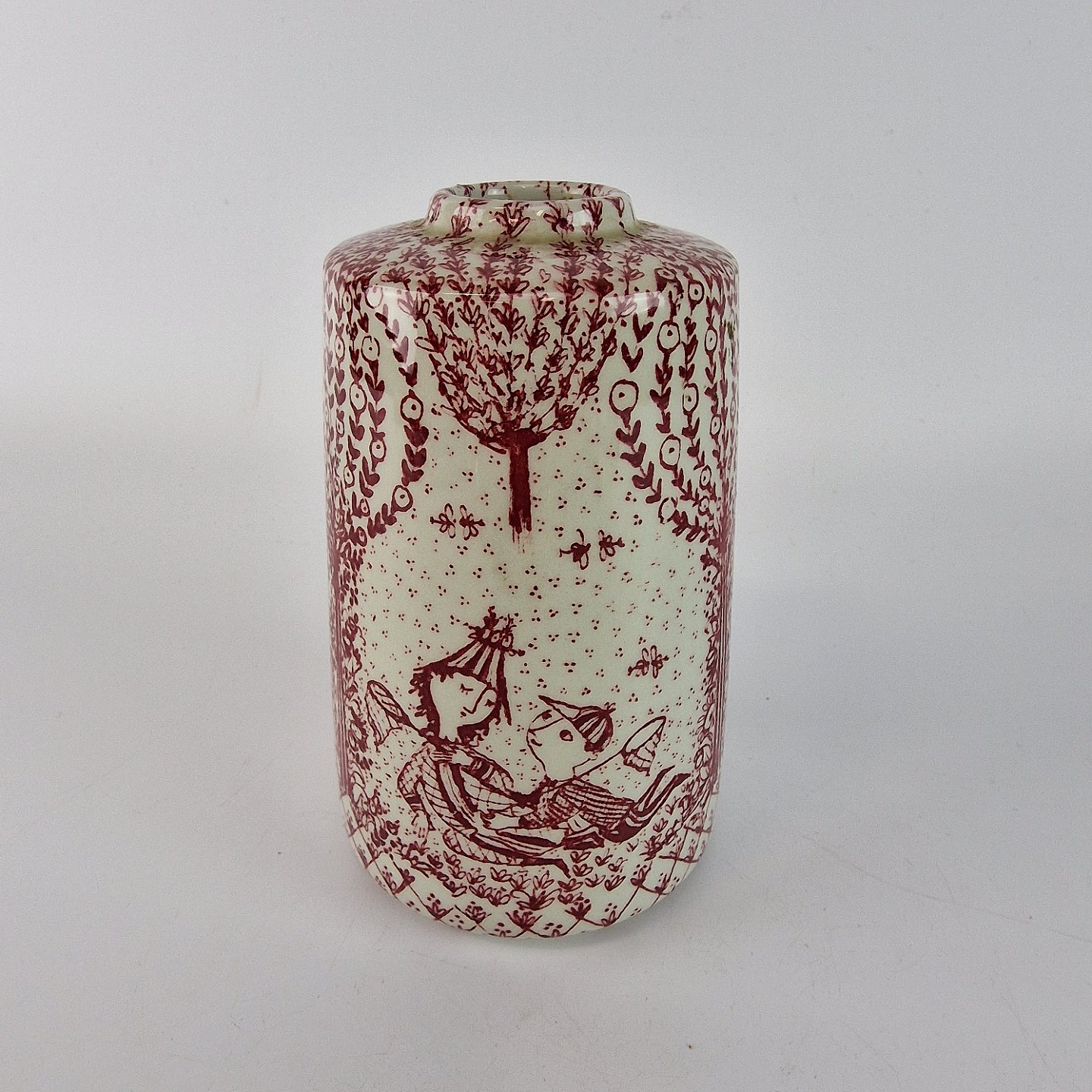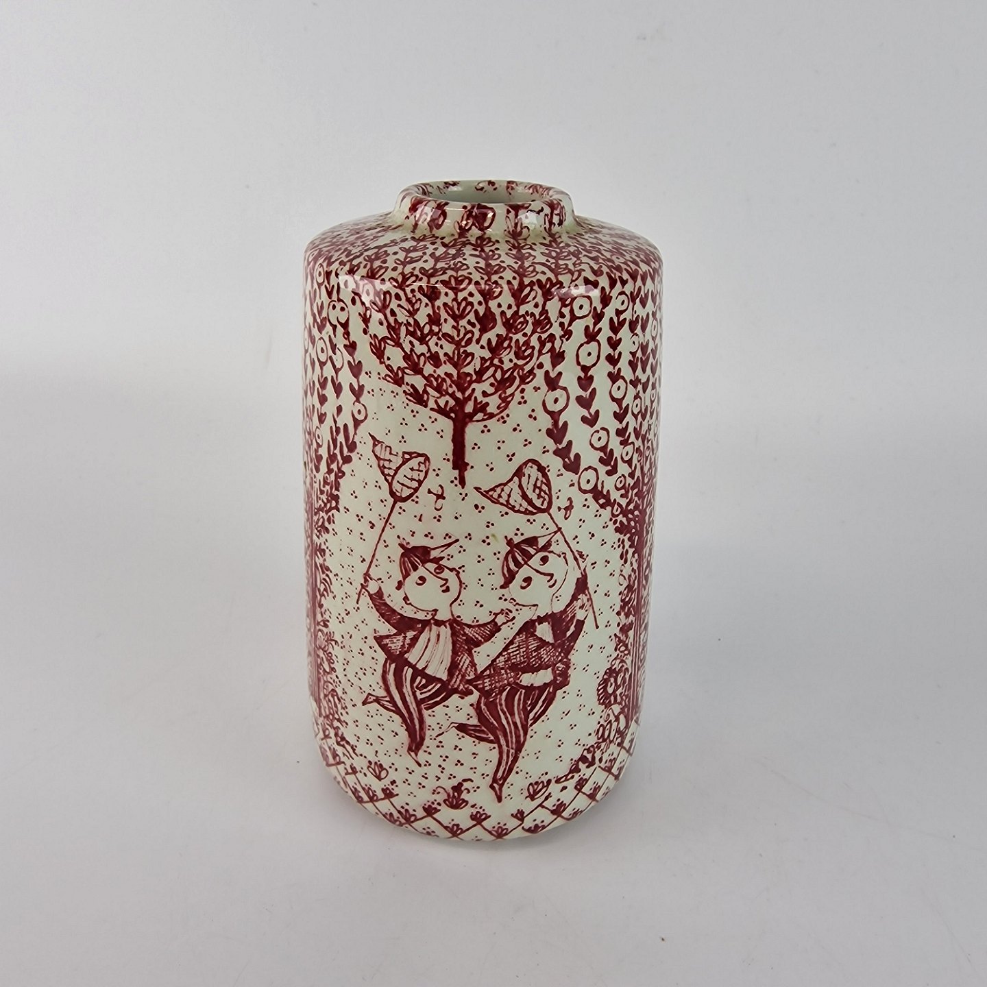 Keramik vase dekoreret med håndmalet røde motiver af kvinder og mænd med sommerfuglenet. Vasen er navngivet Prelude nr. 3086-311