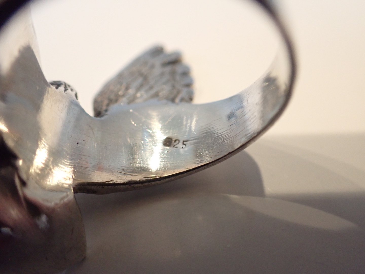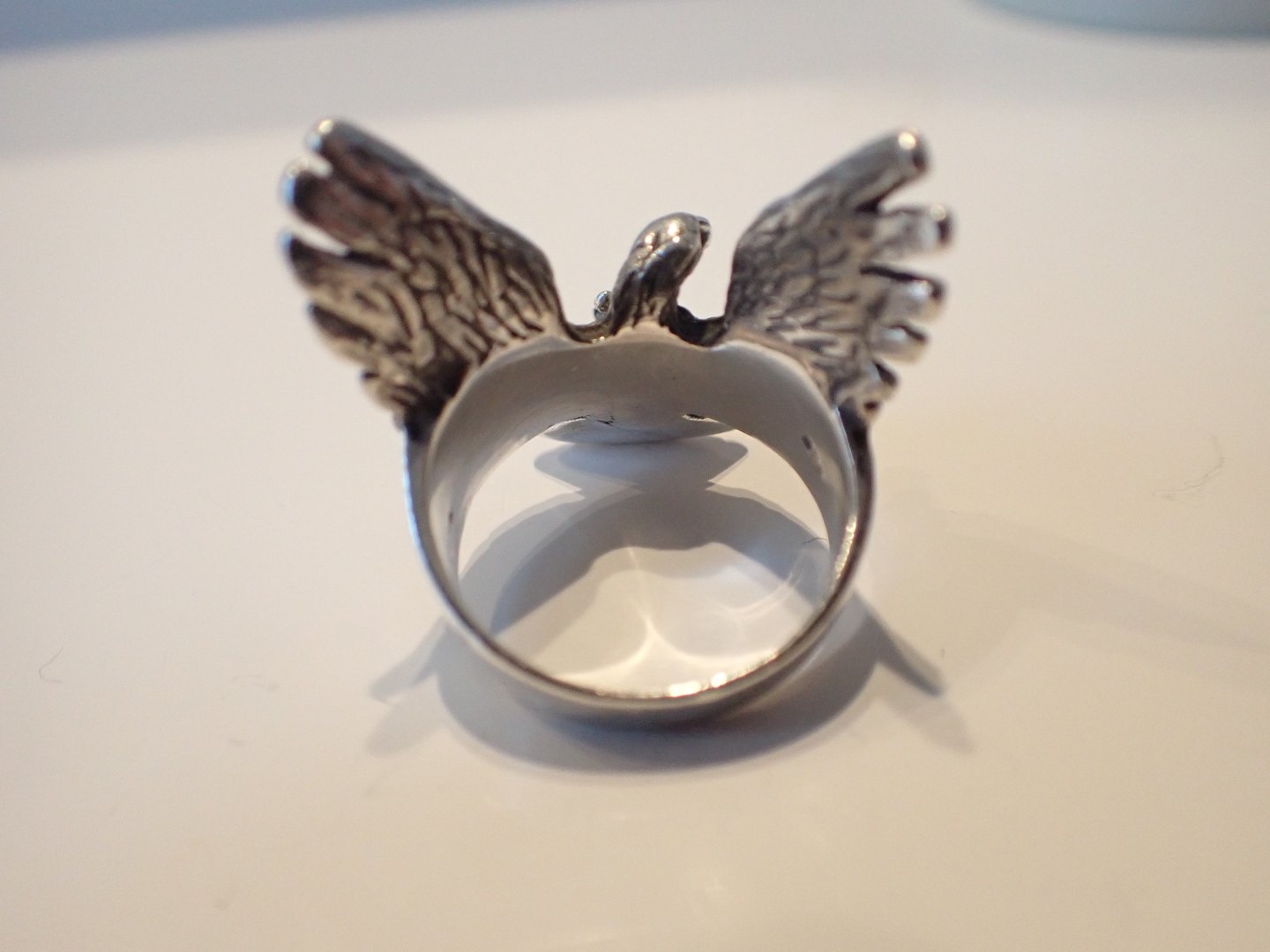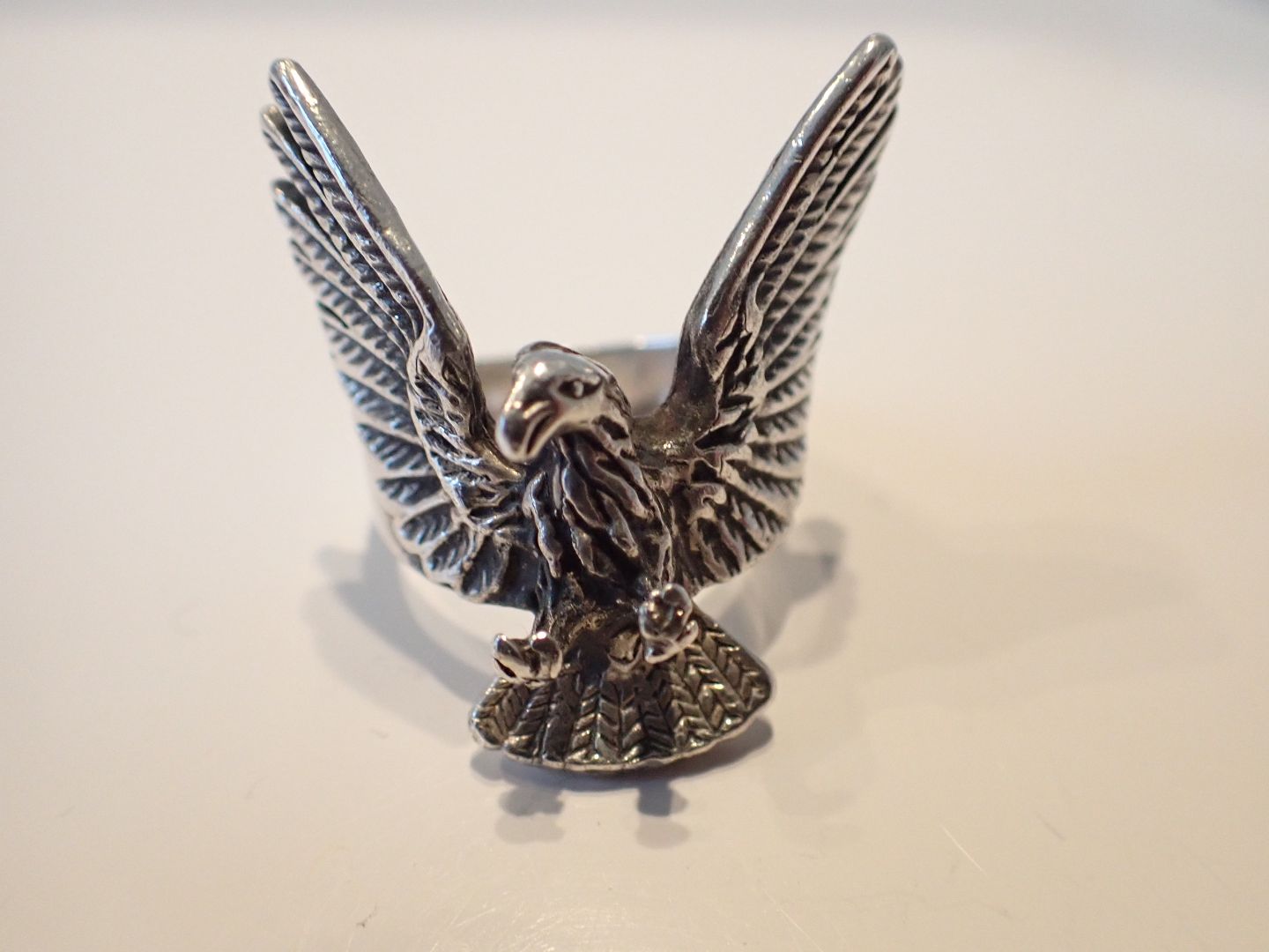Ørnering i sterling sølv. Dansk WK. Størrelse: 62. Vægt: 14,9 gram. Ørnens højde: 3,5 cm. Fin stand.