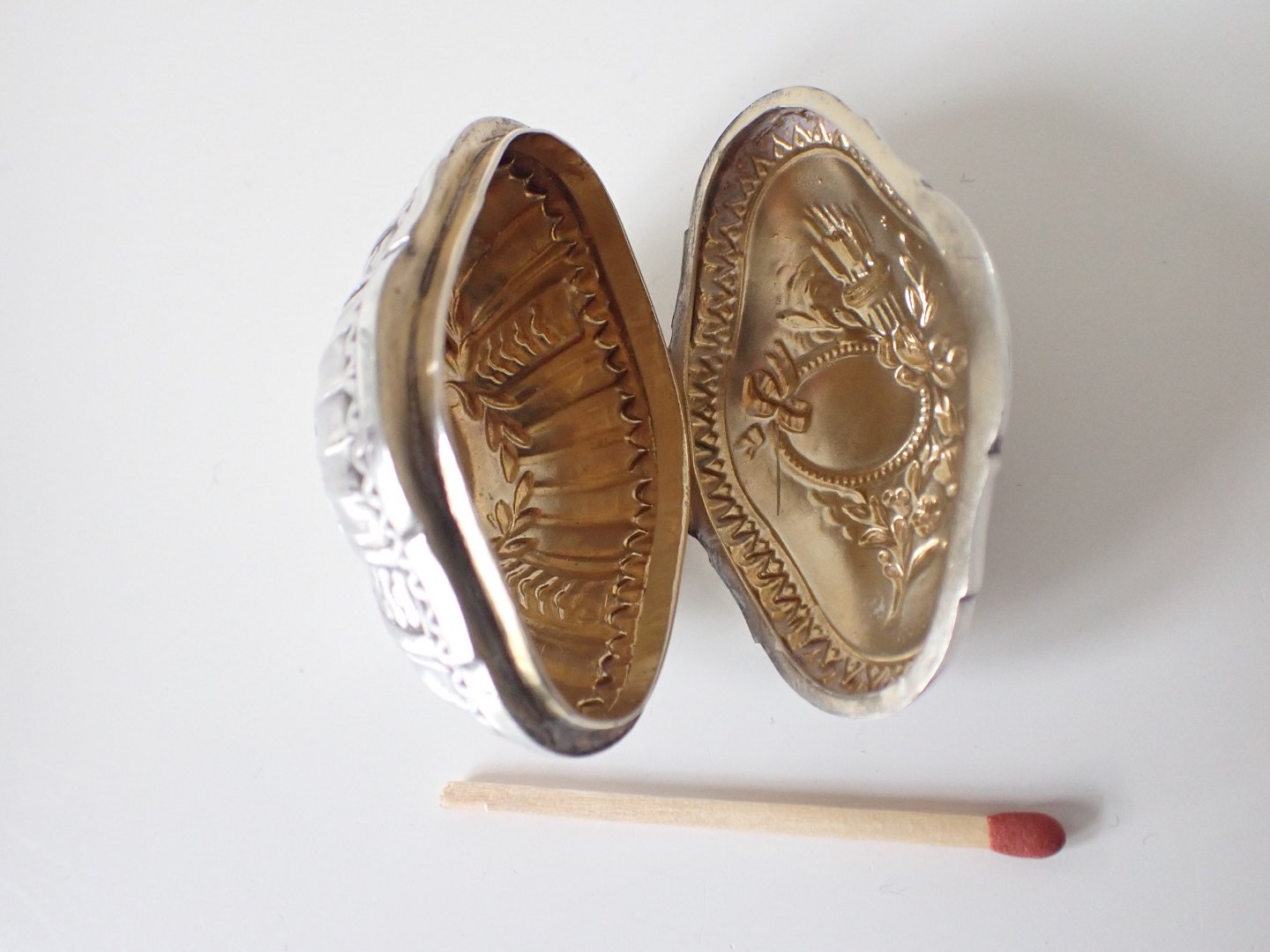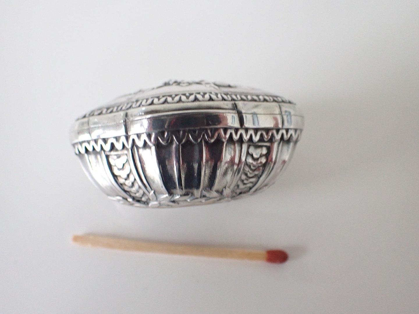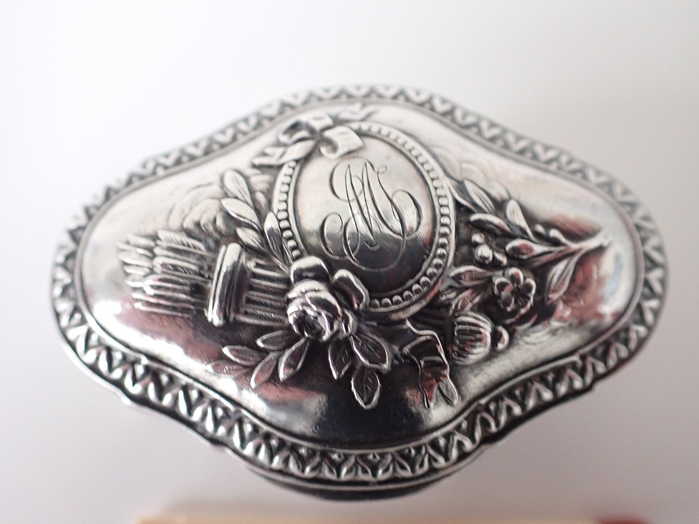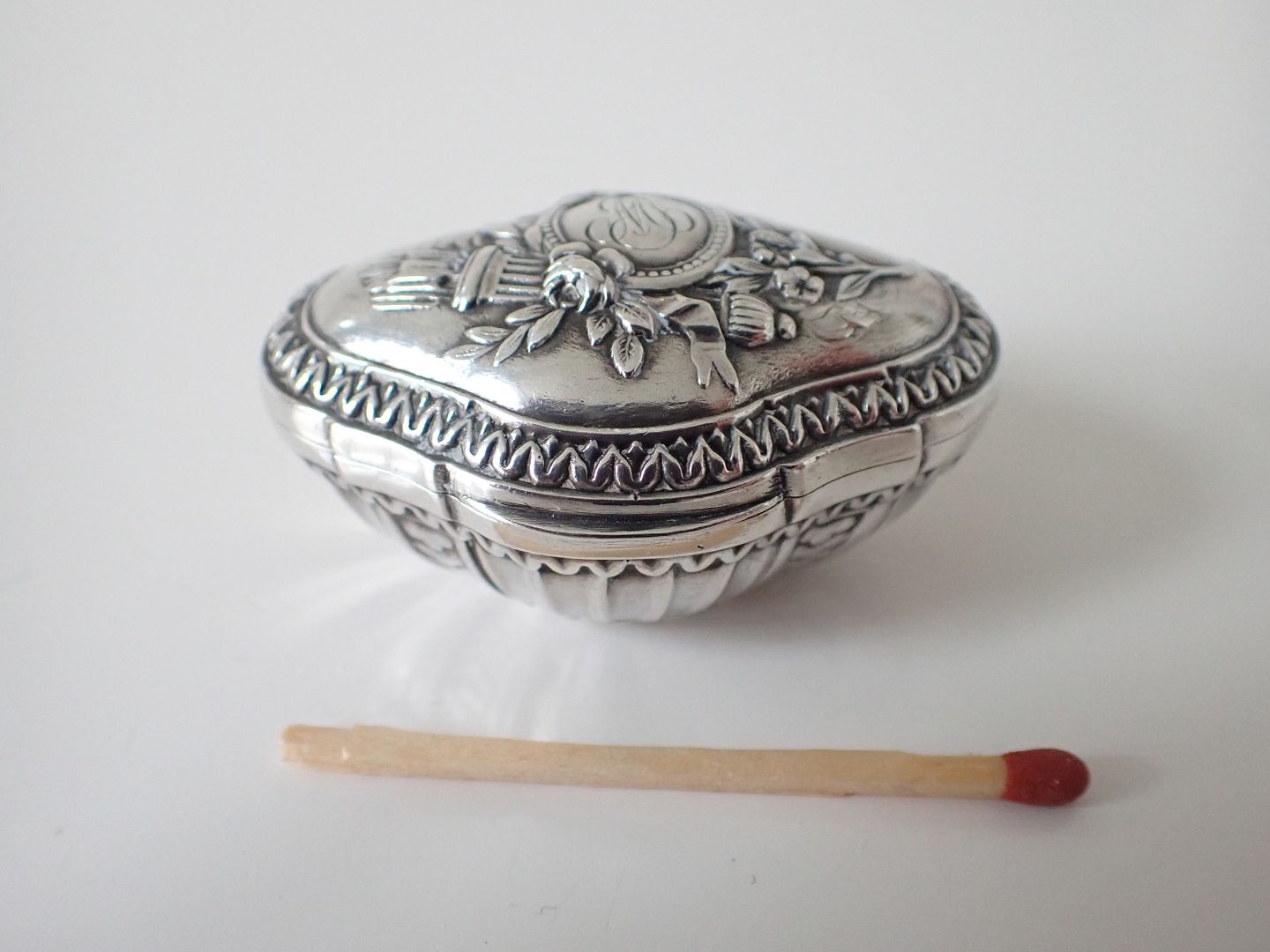 Lille rigt dekoreret fransk pilleæske i sølv med indvendig forgyldning. Ca.1820 Mester LG. Låget er dekoreret med pilekogger bladhang med oval til initialet. Sammenslyngede initialer JM. Kanter med riflet stileseret dekoration. Længde: 5,5 cm. Bredde: 3,7 cm. Dybde: 2,8 cm. Vægt: 23 gram. I fin stand - flot indvendig forgyldning.