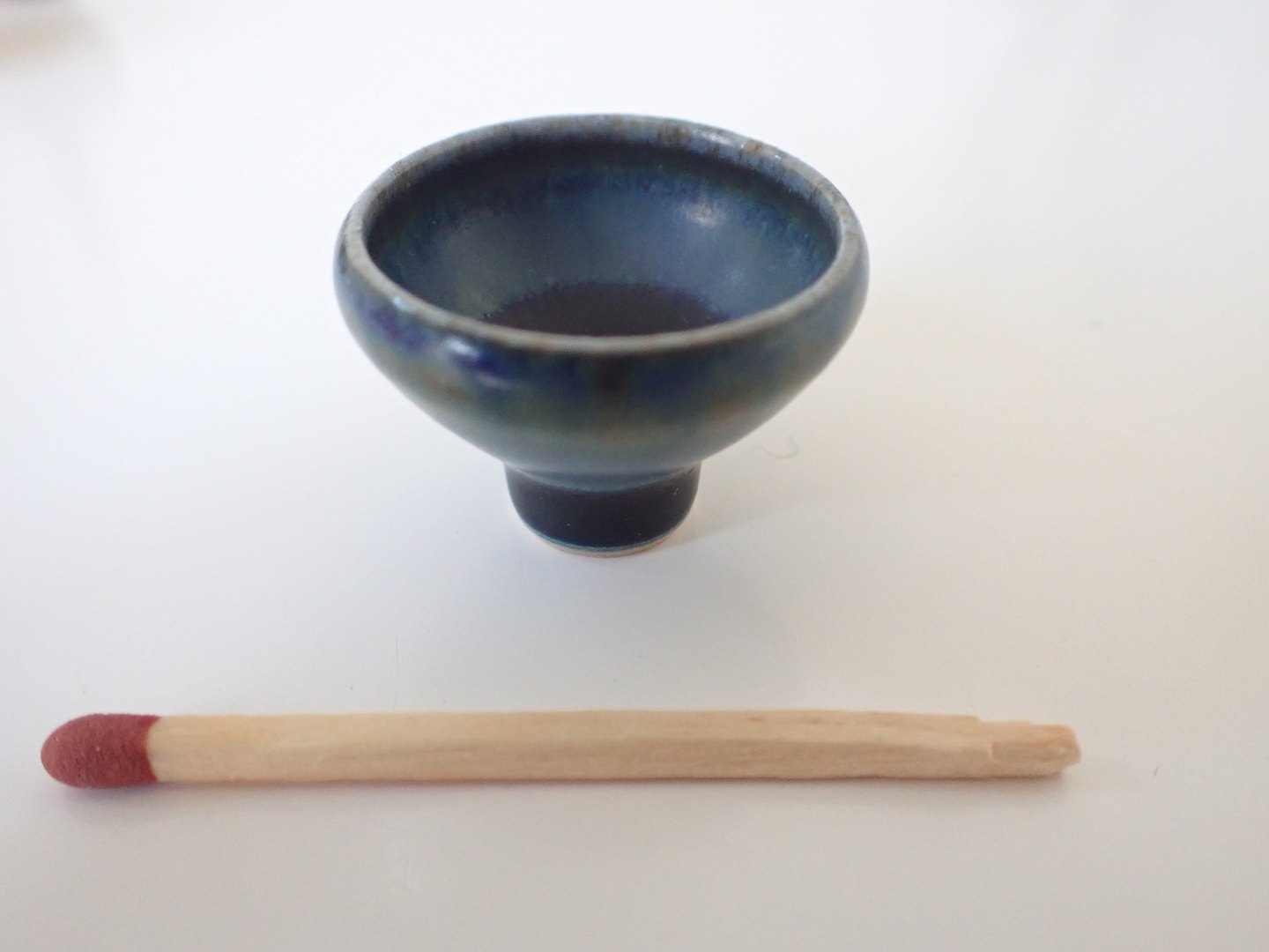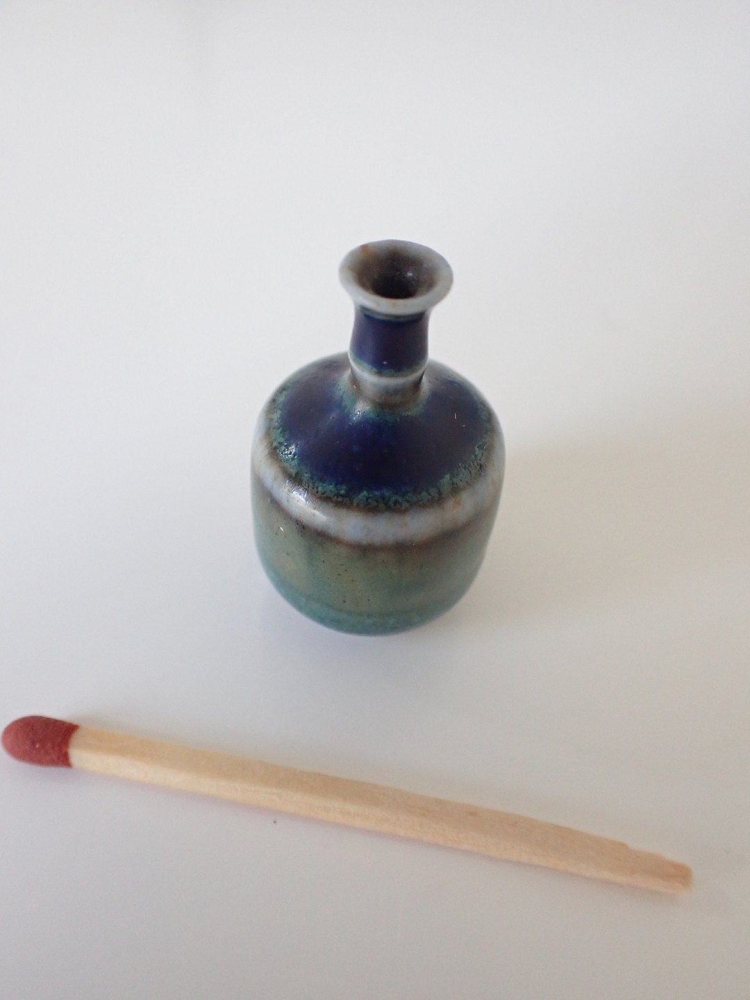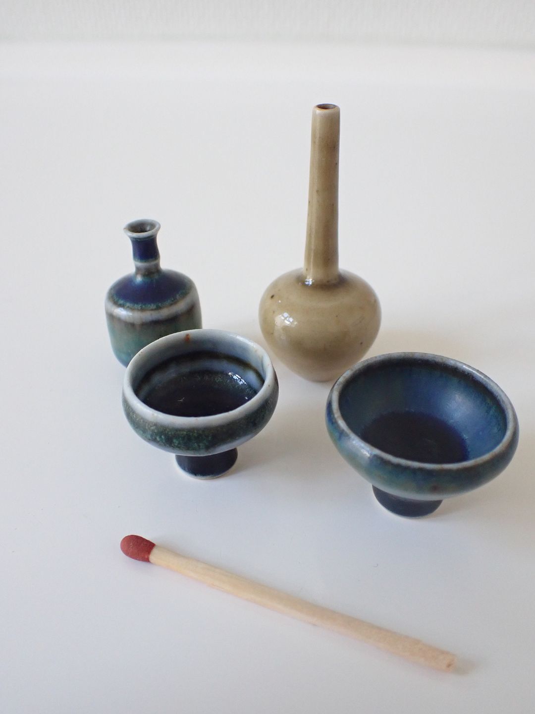 4 miniaturevaser/skåle i stentøj med blå/grønne og brune glasurer. Höganäs I.R. og I.B. Højde: 2 - 5,8 cm. Bredeste diameter: 2,1 - 3,1 cm. I fin stand. Priser: 150 - 200 kr. pr stk.