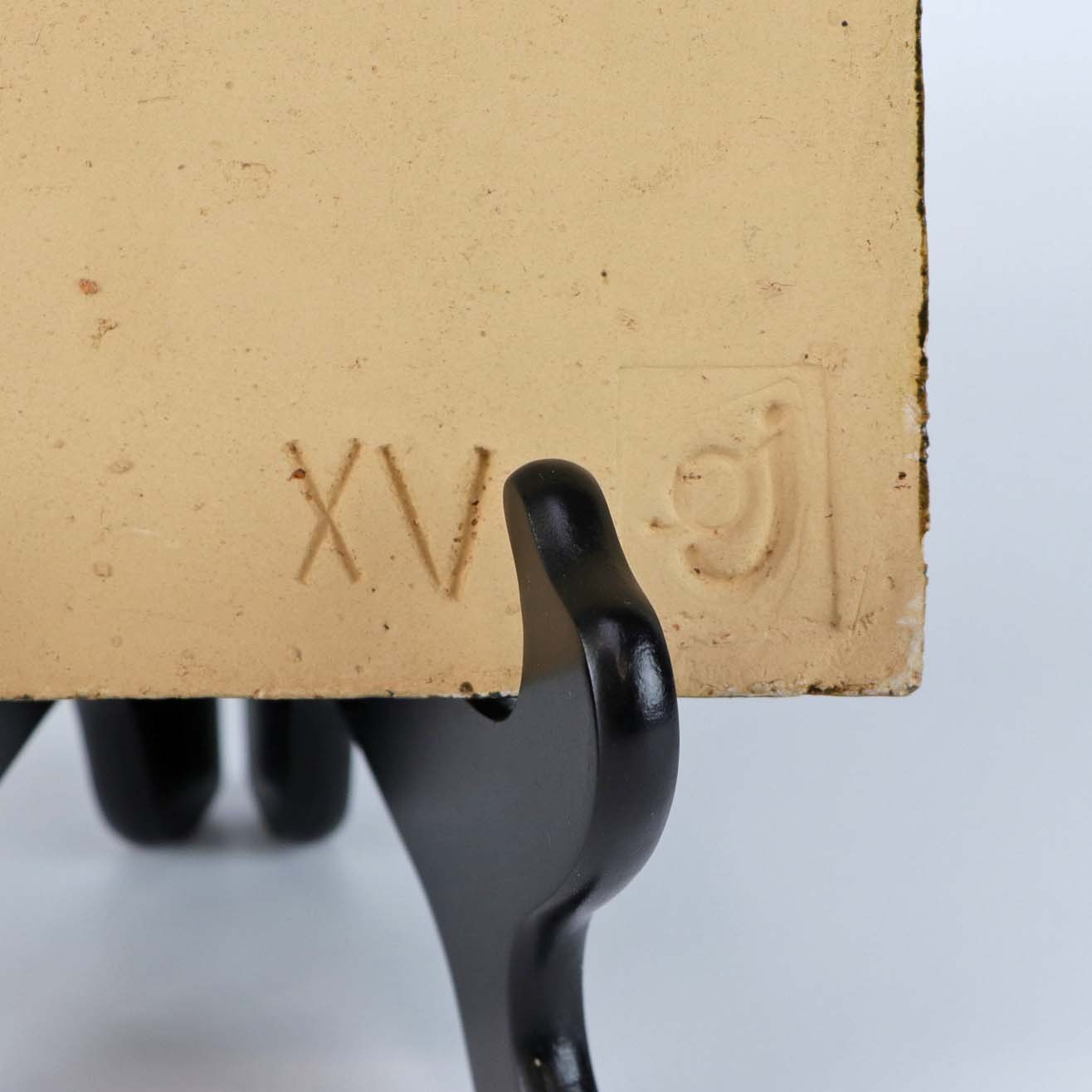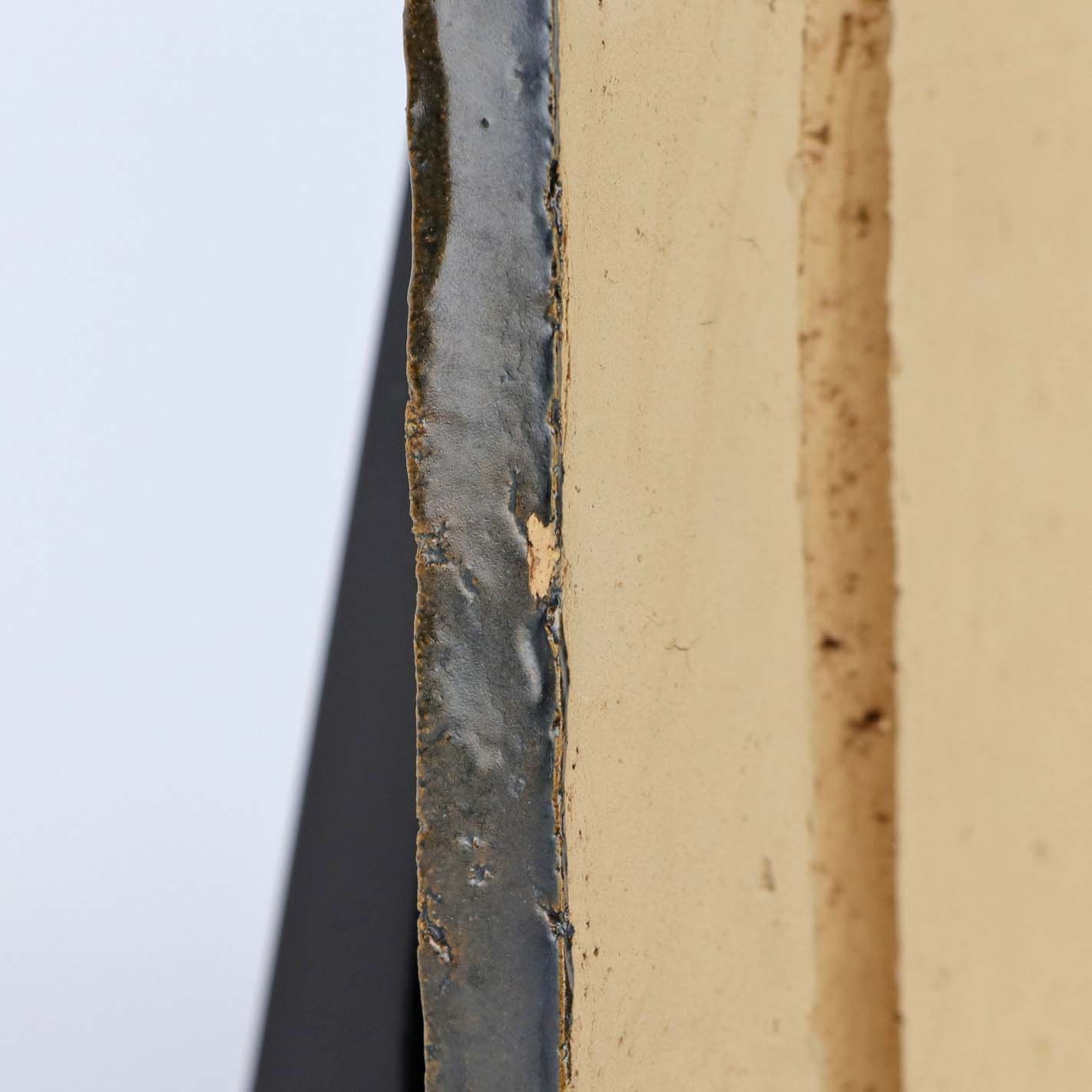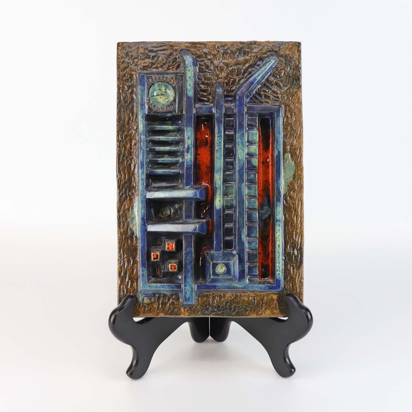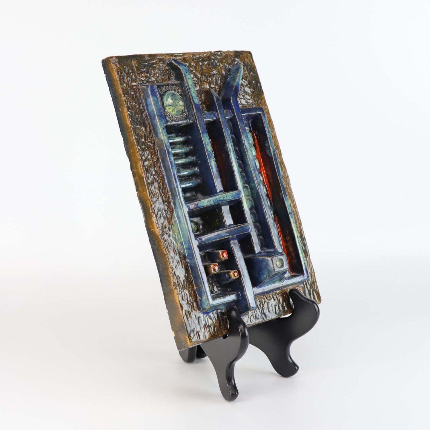 Relief i glaseret keramik med abstrakt motiv i brune, blå og orangerøde farver. Nr XV