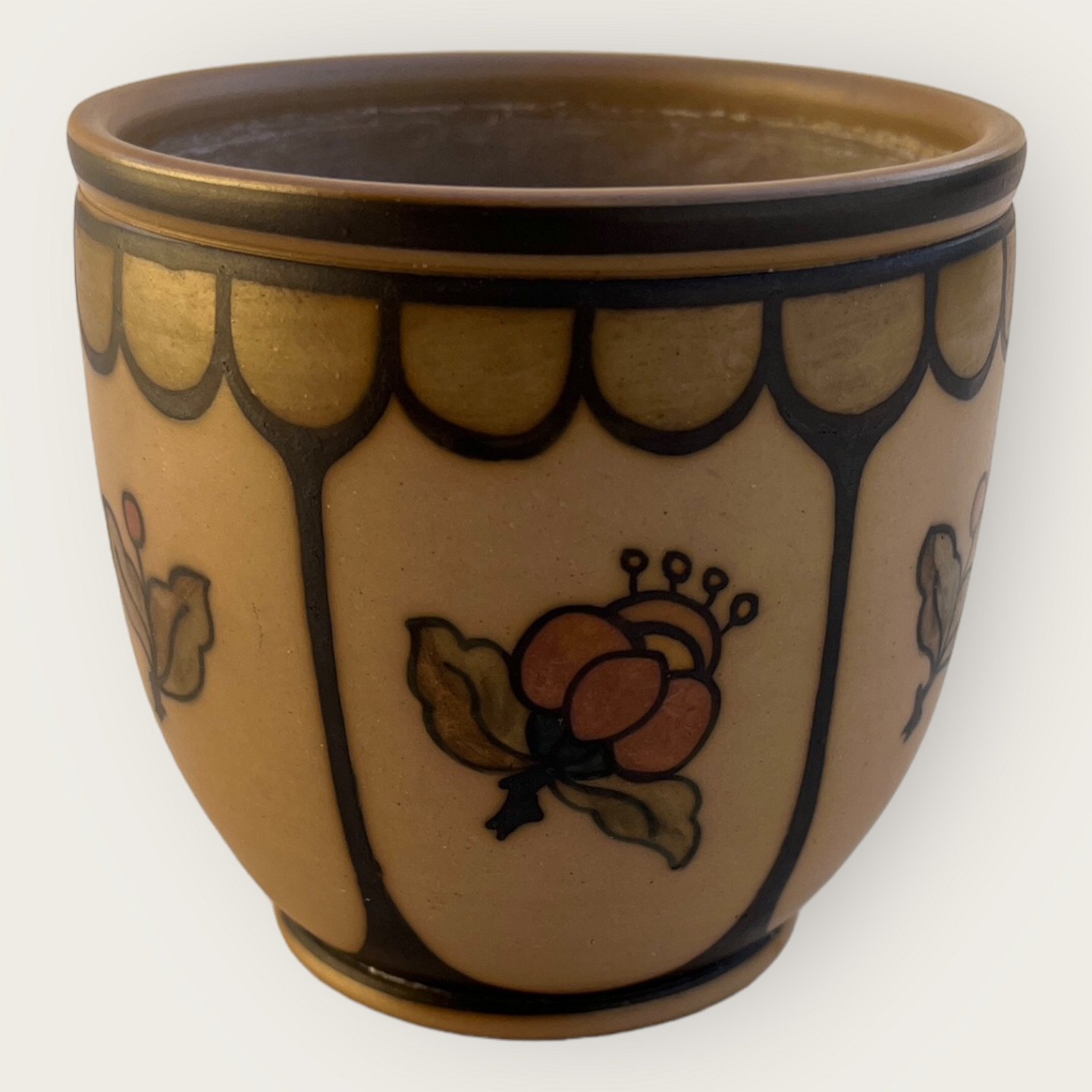 | Bornholmsk keramik, Hjorth, Brun stentøj, Vase med blomstermotiv, Nr. 64, 9,5cm i diameter, 9cm høj *Pæn stand*