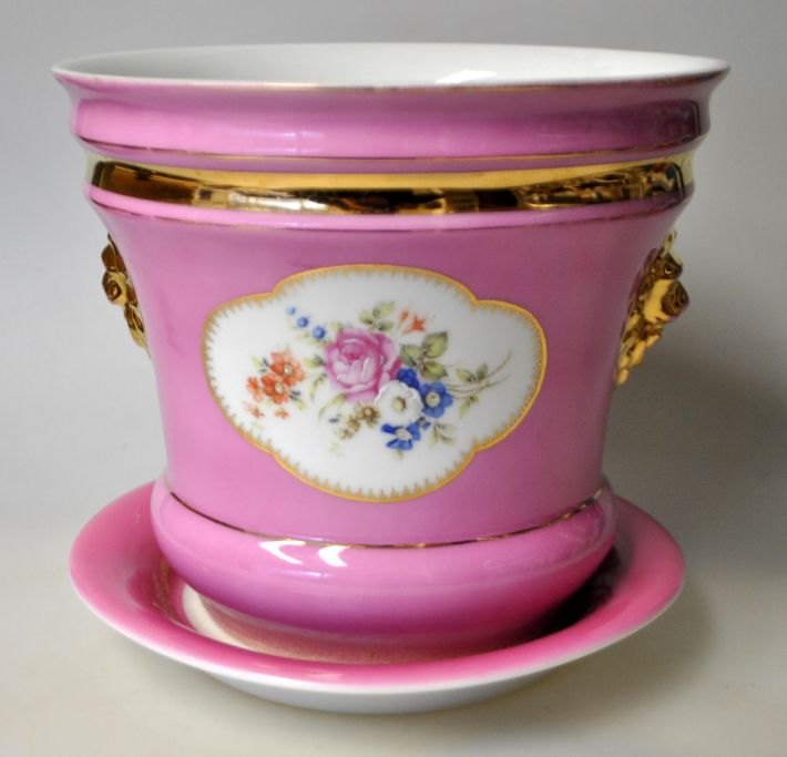 Lyserød urtepotte i porcelæn, C. Tielsch, Waldenburg - Altwassser, Tyskland (nu Polen) 1890 - 1914. Med underskål. Sider dekoreret med forgyldte løvehoveder. På siden endvidere blomsterdekorationer i oveføringsteknik - fremhævet med emaljemaling. Stemplet. H.: 16 cm.
