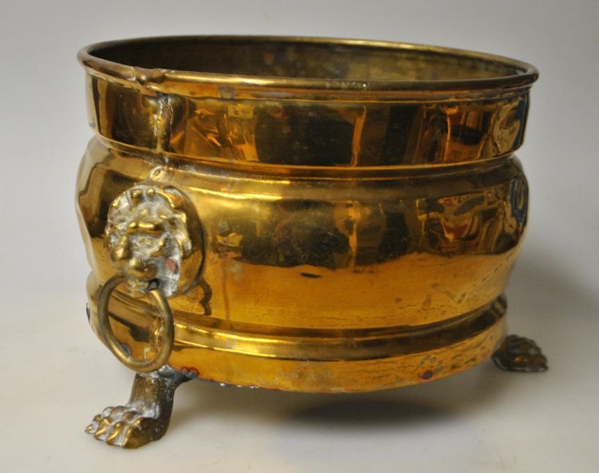 Antik messing urtepotte skjuler, 19. årh. Danmark. Med to hanke i form af løver med ringe i munden og løvefødder. H.: 13 cm. Dia: 17,5 cm.