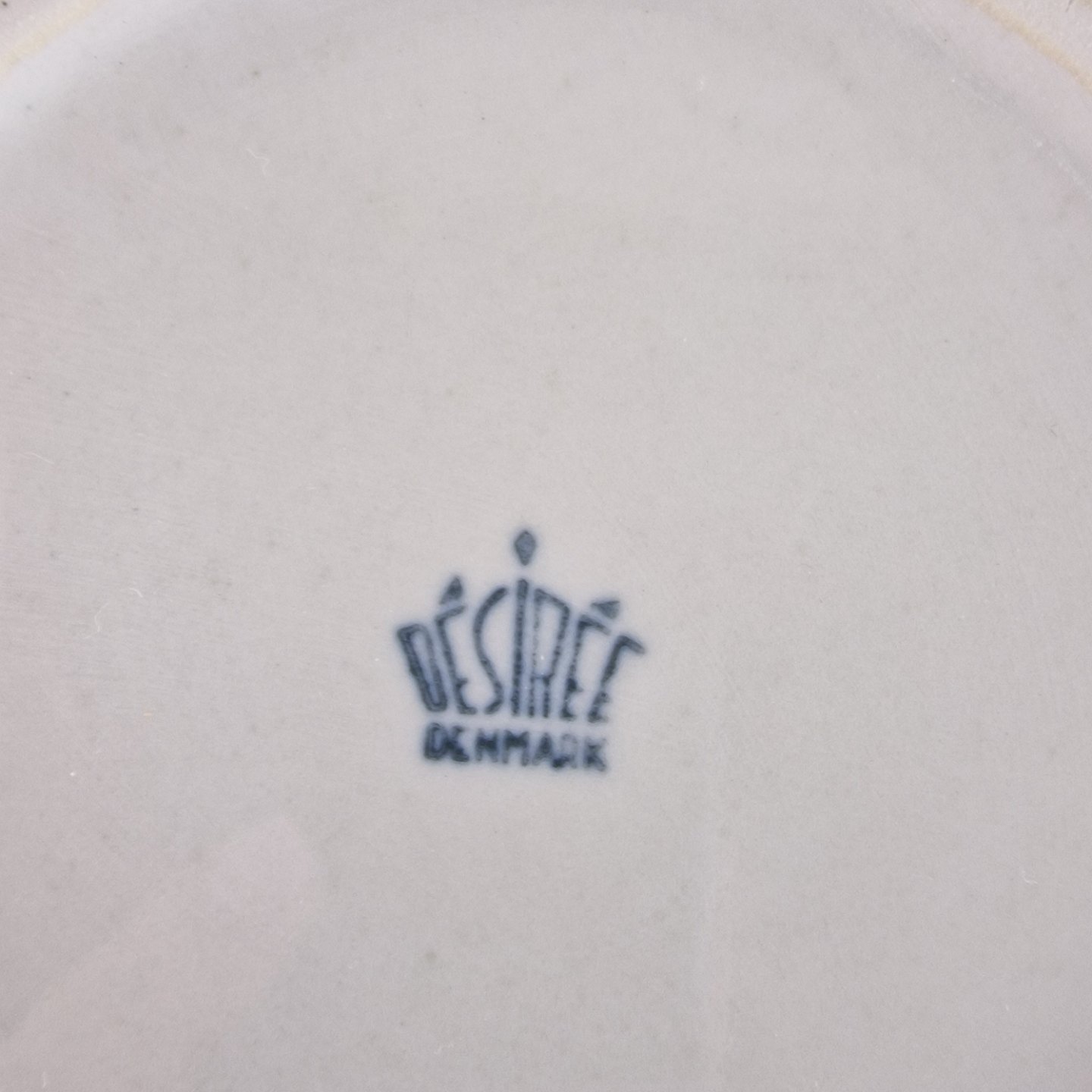 Diskos er af ovnfast stentøj. Stellet er gråt og håndmalet med brune og grønlige detaljer