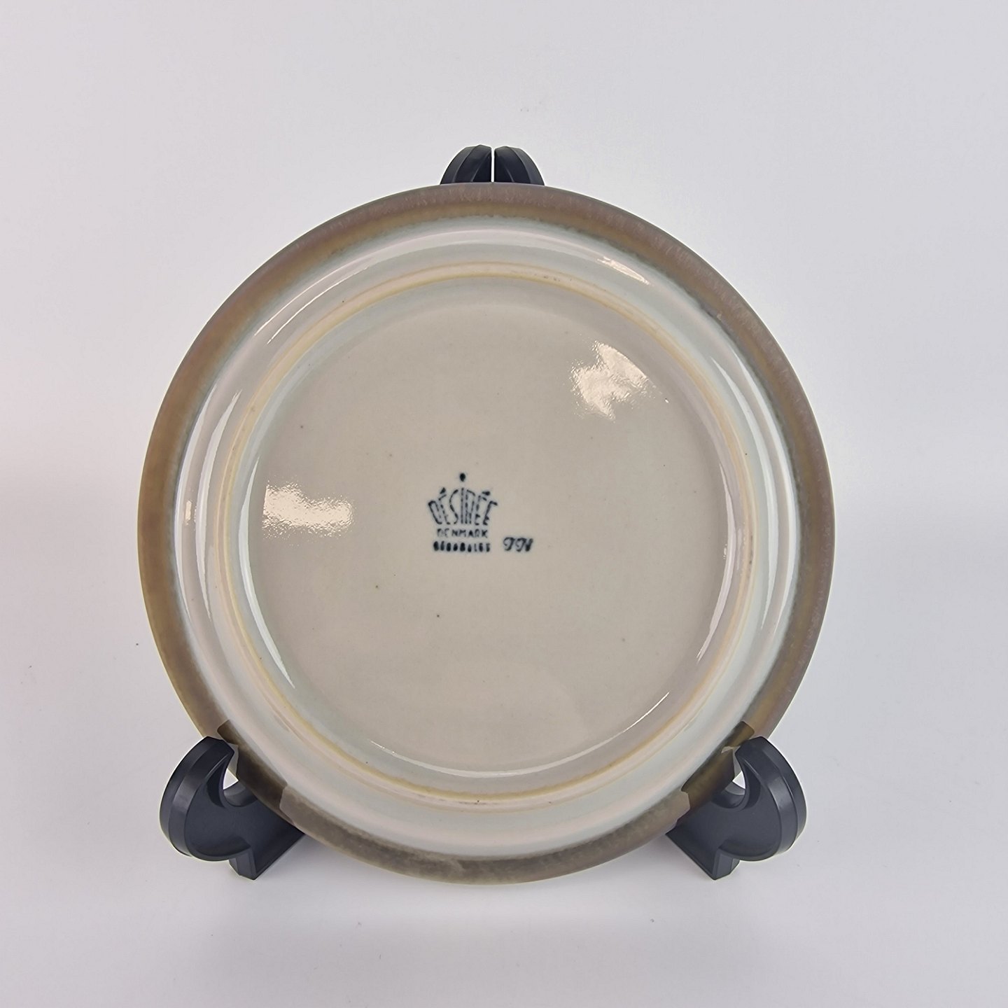 Diskos er af ovnfast stentøj. Stellet er gråt og håndmalet med brune og grønlige detaljer