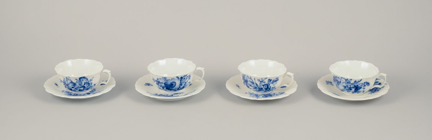 Fire par tekopper i blåmalet porcelæn.