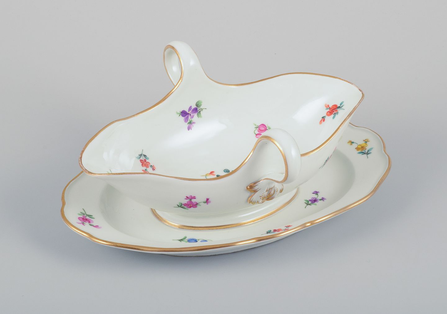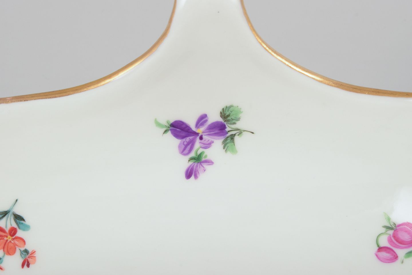 Håndmalet med polykrome blomstermotiver, guldkant.