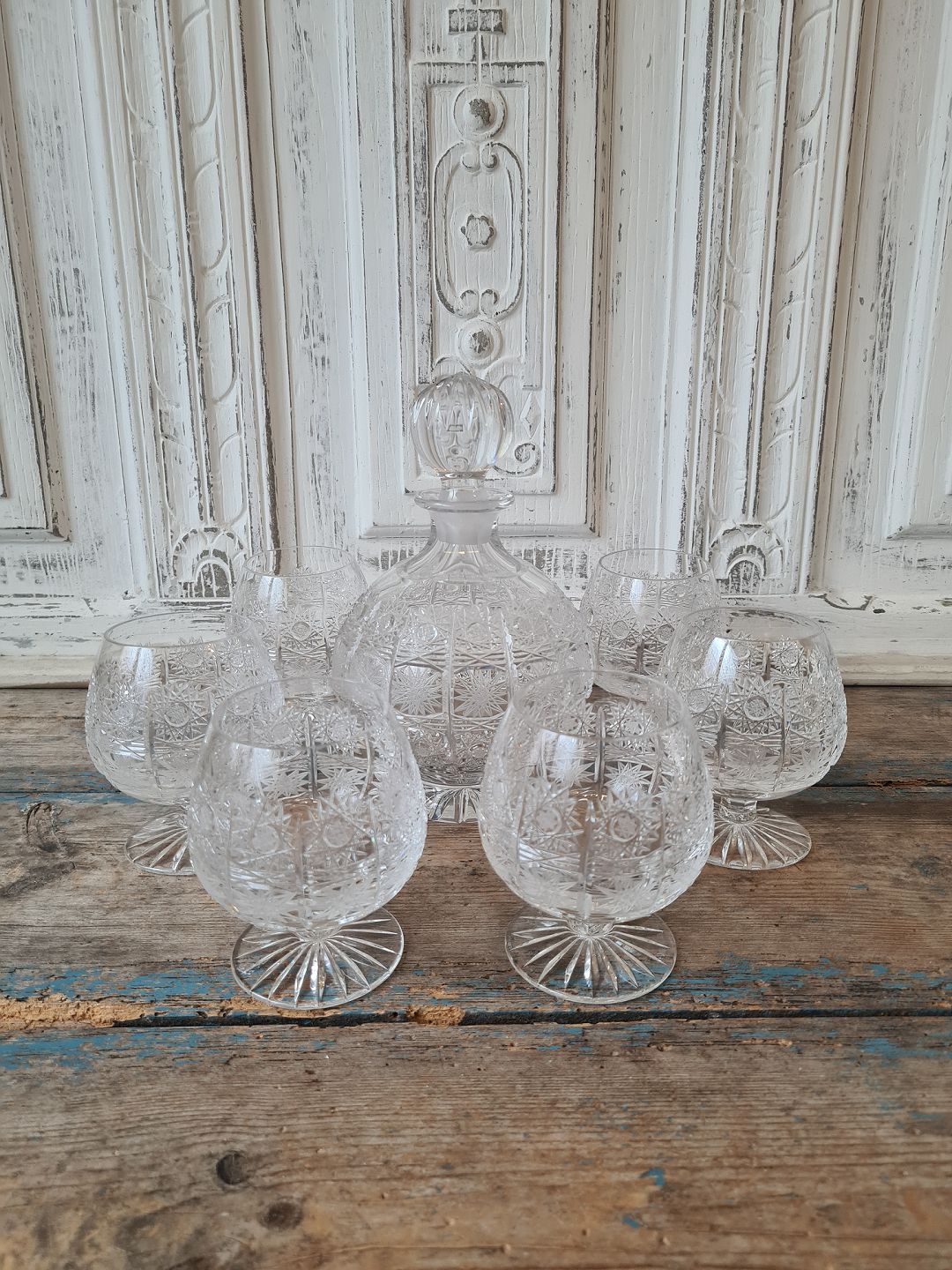 Sæt på 6 cognac glas samt karaffel i slebet krystal