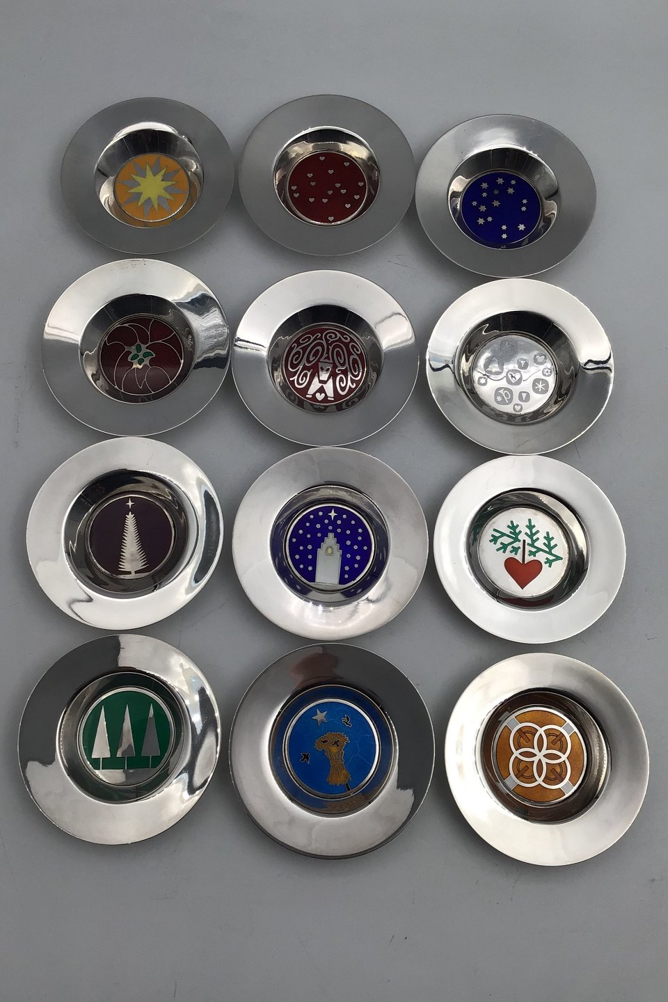 Peter Hertz Sterling Sølv / Emalje Skåle Sæt (12) (1968-1979) Måler Diam 7.5 cm (2.95 inch) H 1 cm (0.39 inch) Samlet Vægt 584 gr. (20.60 oz) (Forskellige Julemotiver)