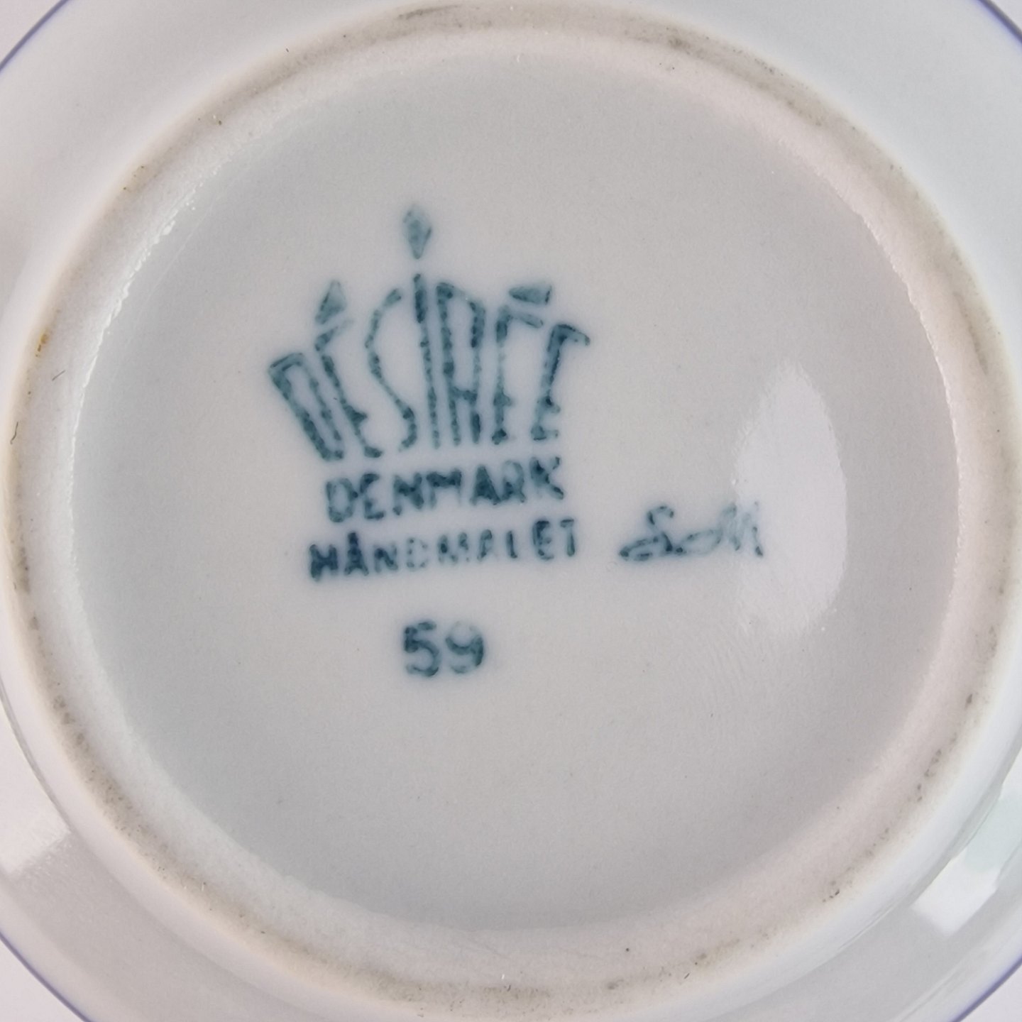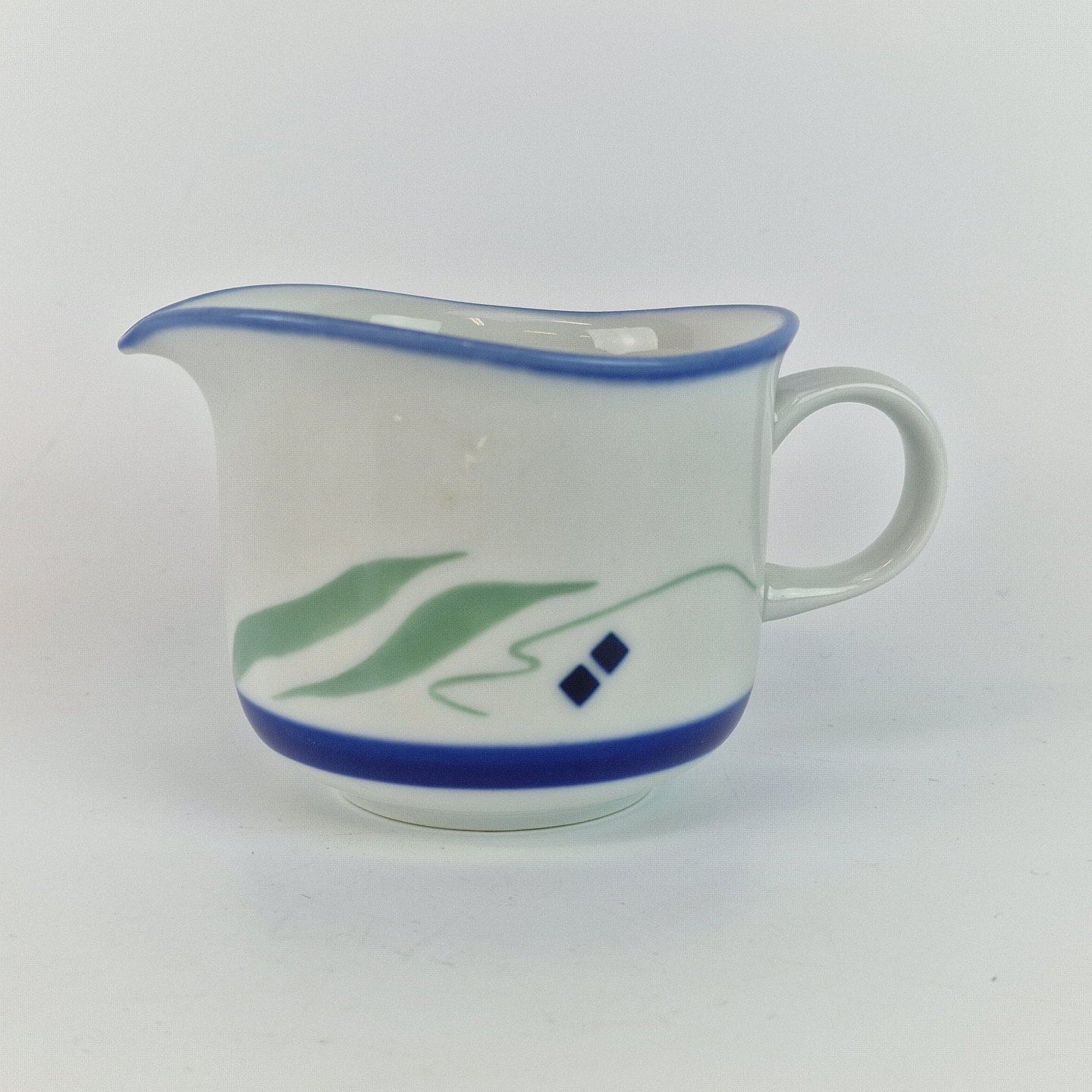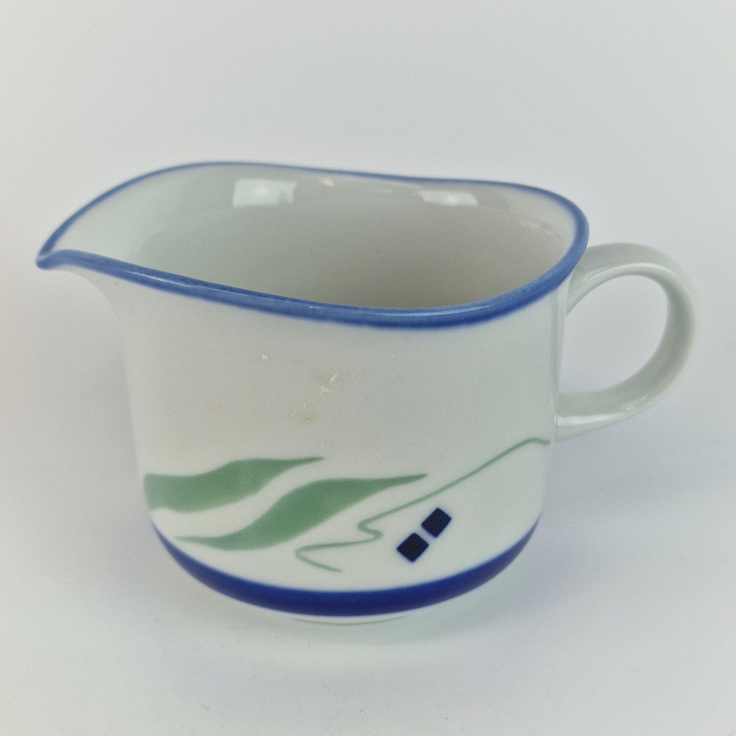 Springtime er af porcelæn, som er glaseret hvidt, malet med blå striber og abstrakt mønster i en lys grøn og blå farve.