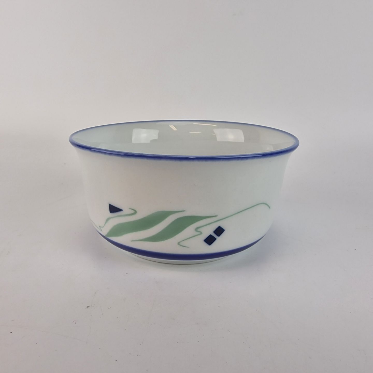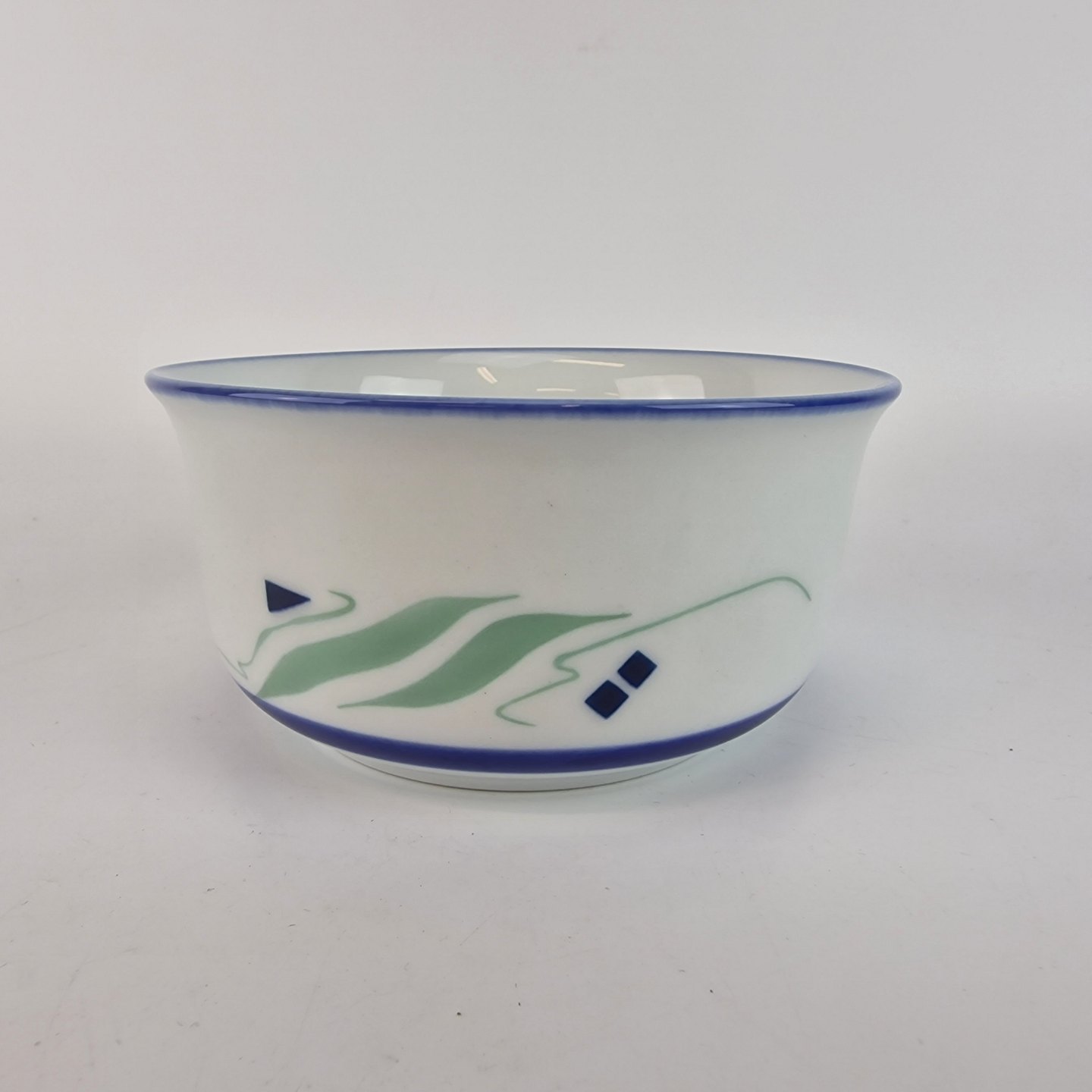 Springtime er af porcelæn, som er glaseret hvidt, malet med blå striber og abstrakt mønster i en lys grøn og blå farve.