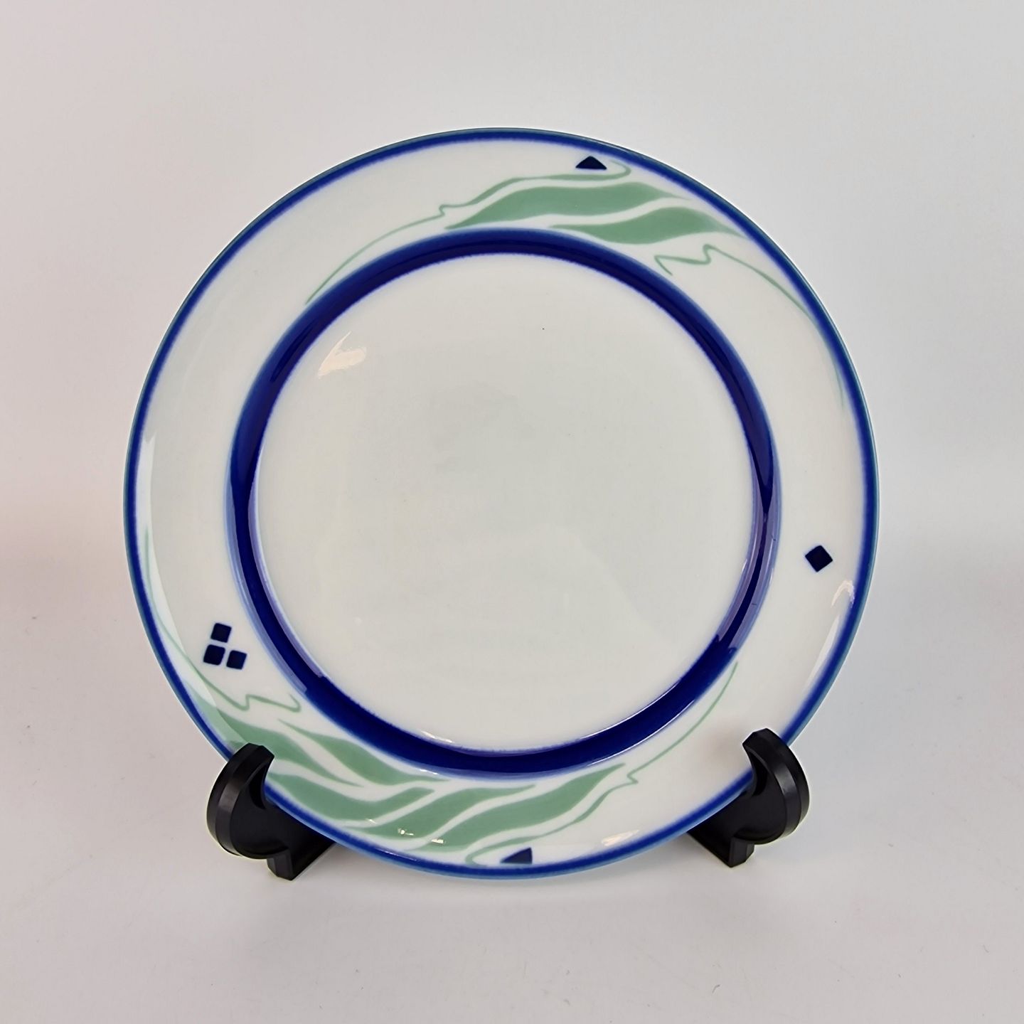 Springtime er af porcelæn, som er glaseret hvidt, malet med blå striber og abstrakt mønster i en lys grøn og blå farve.