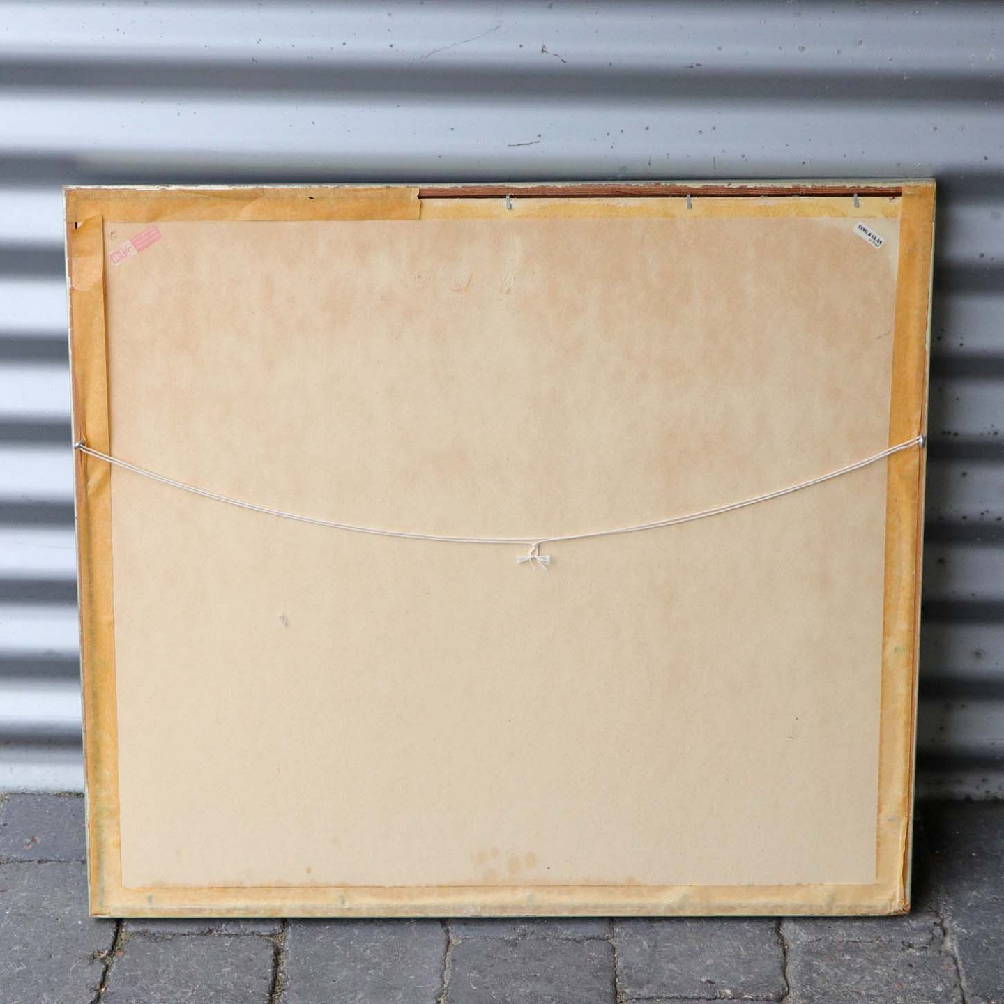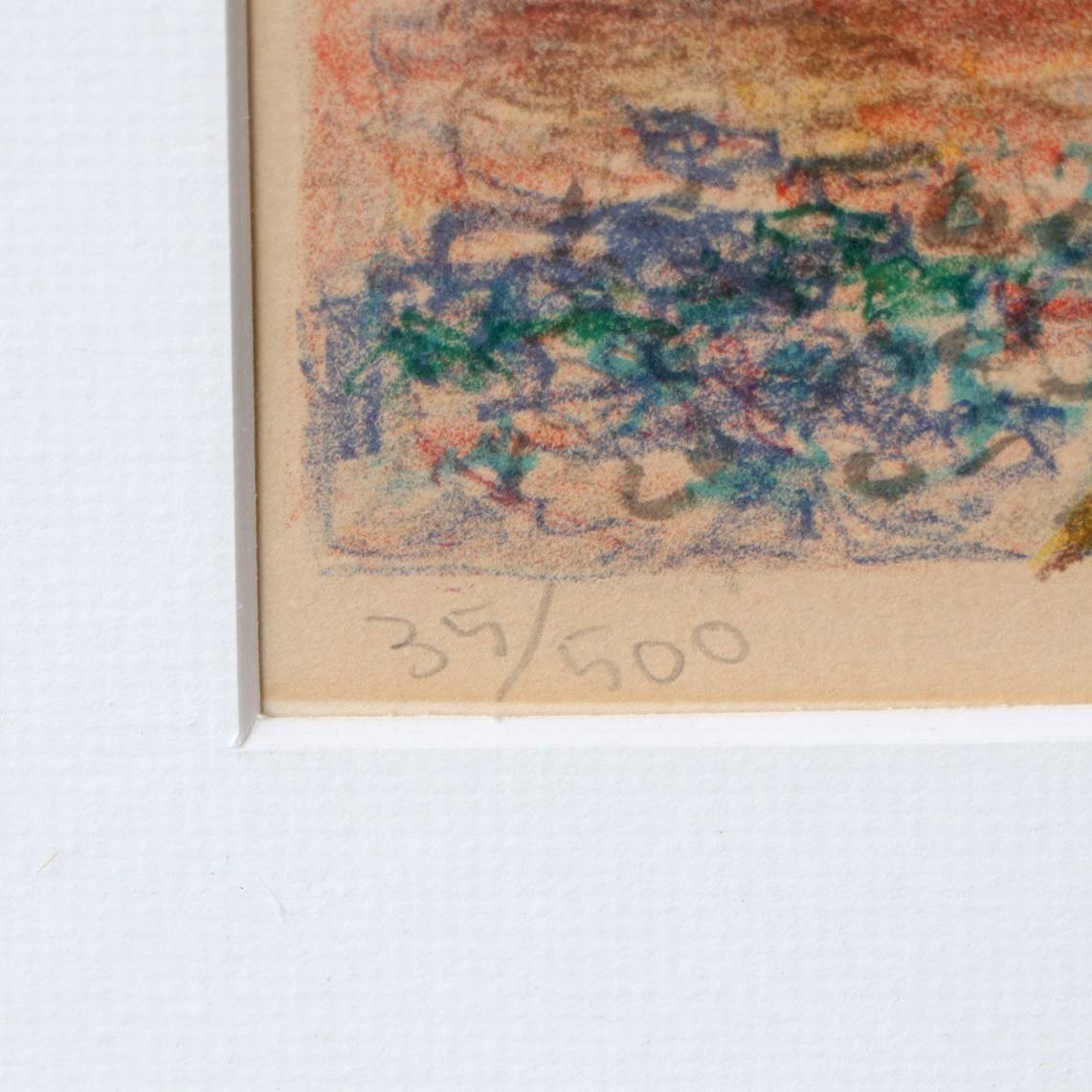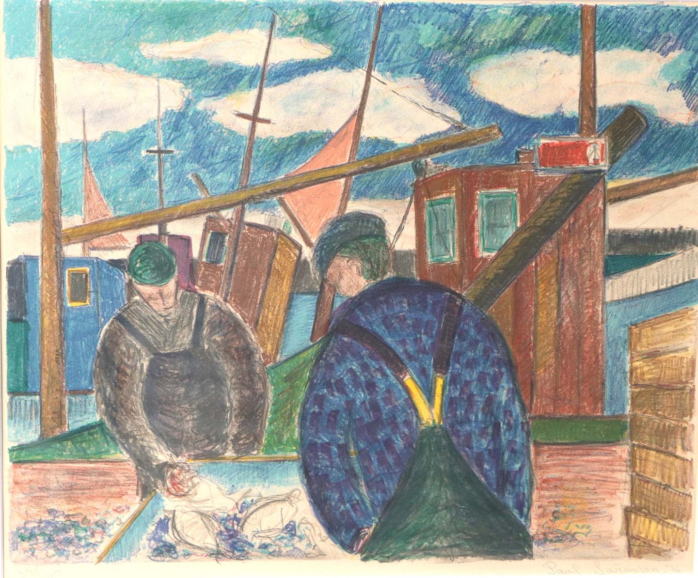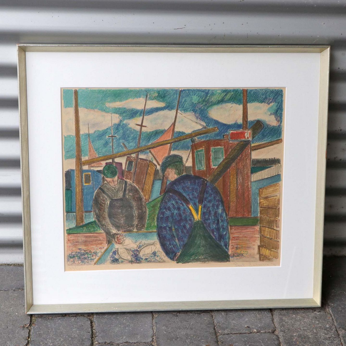 Indrammet litografi med passepartout i sølvmalet ramme. Litografisk tryk nr 35/500 fra år 1976 med portræt af to fiskere ved havneområde.