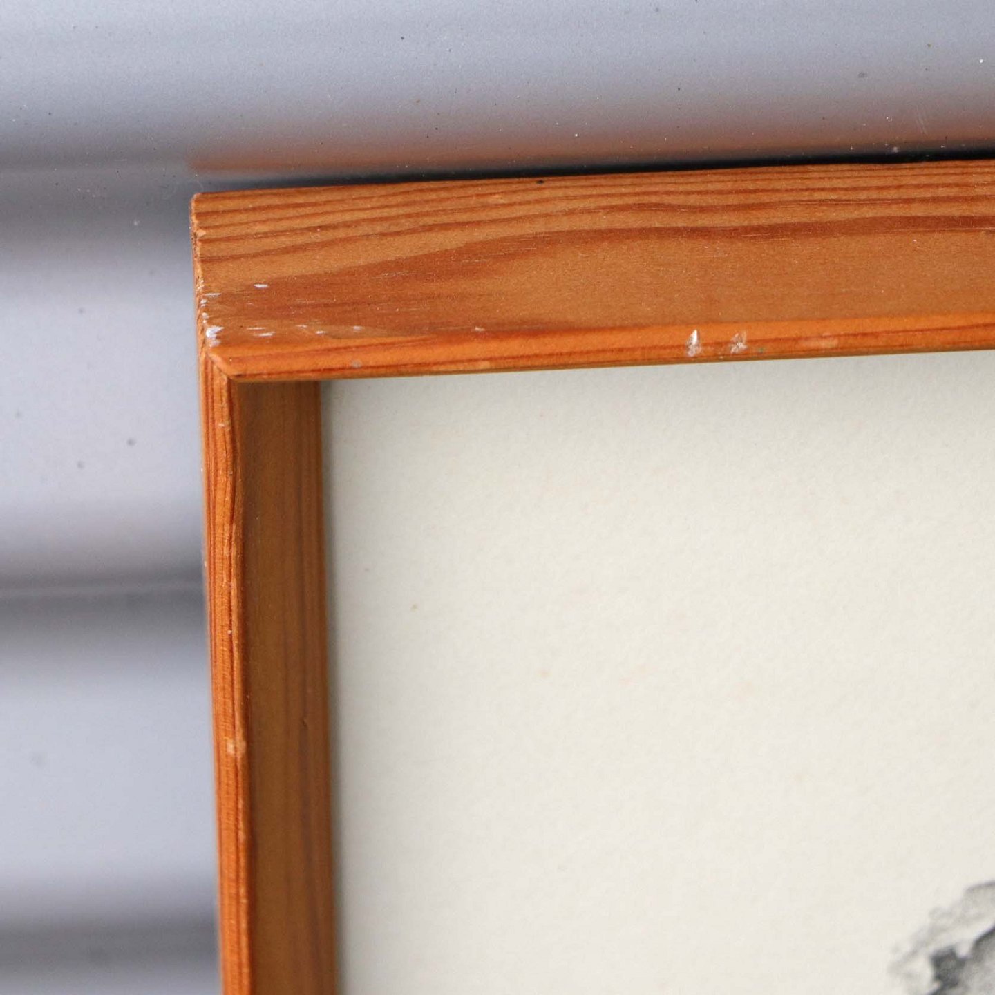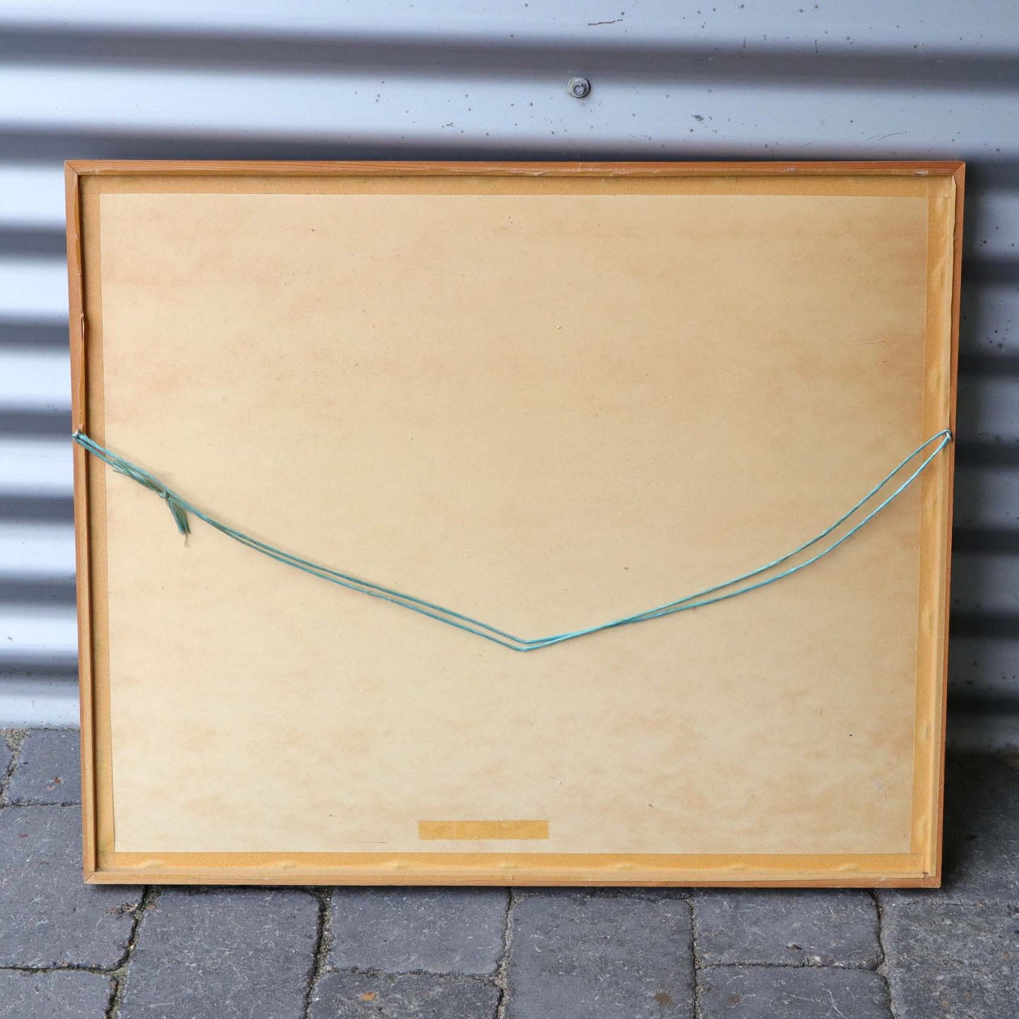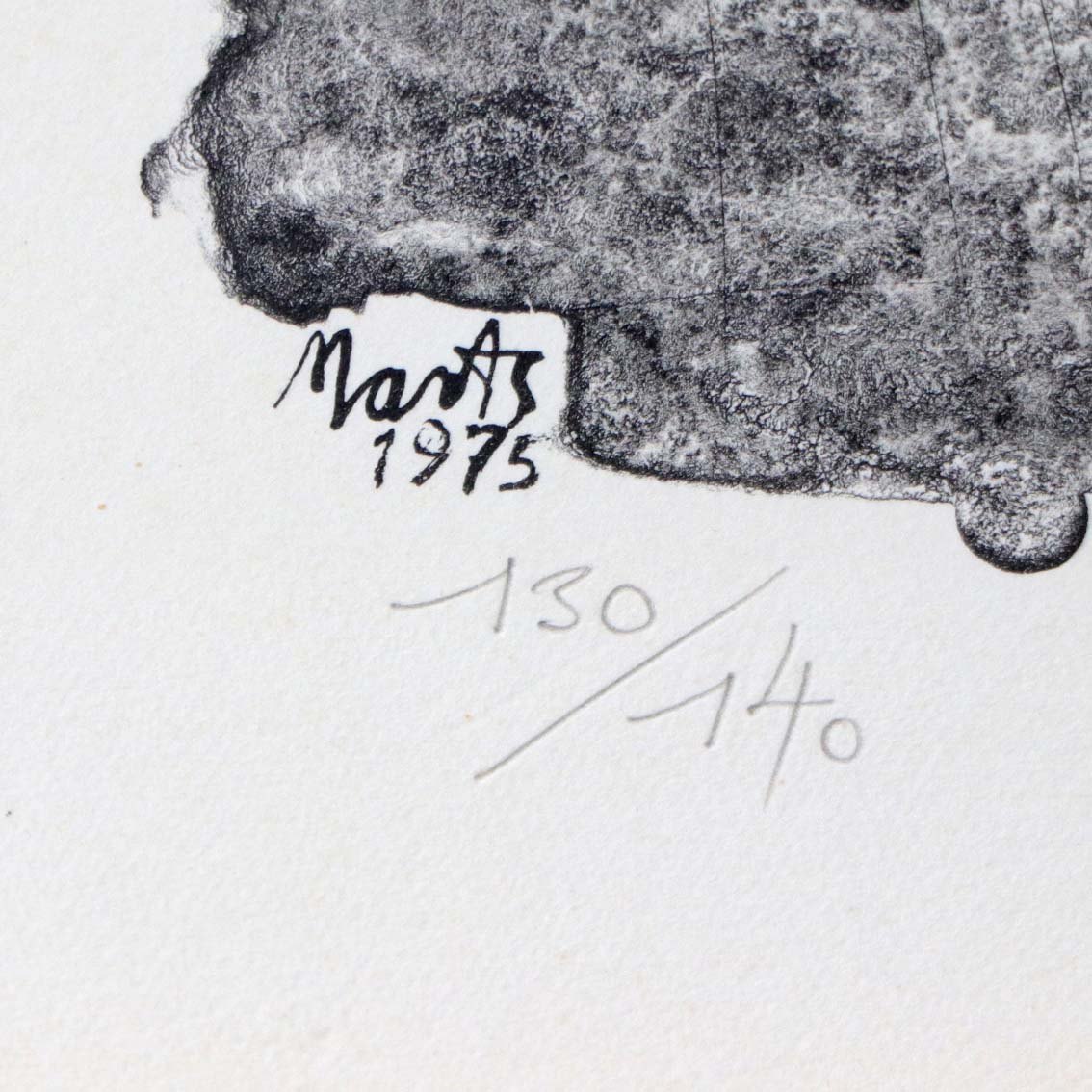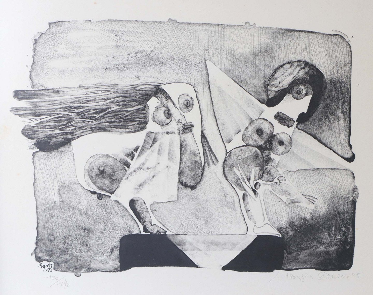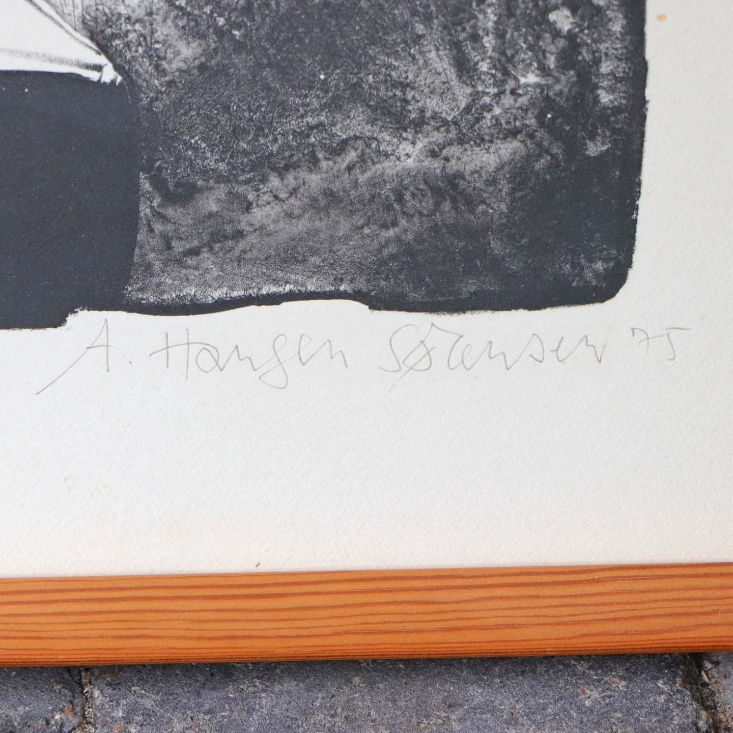 Indrammet litografi i ramme. Litografisk tryk nr 130/140 fra 1975 med abstrakt motiv i sort og hvid.
