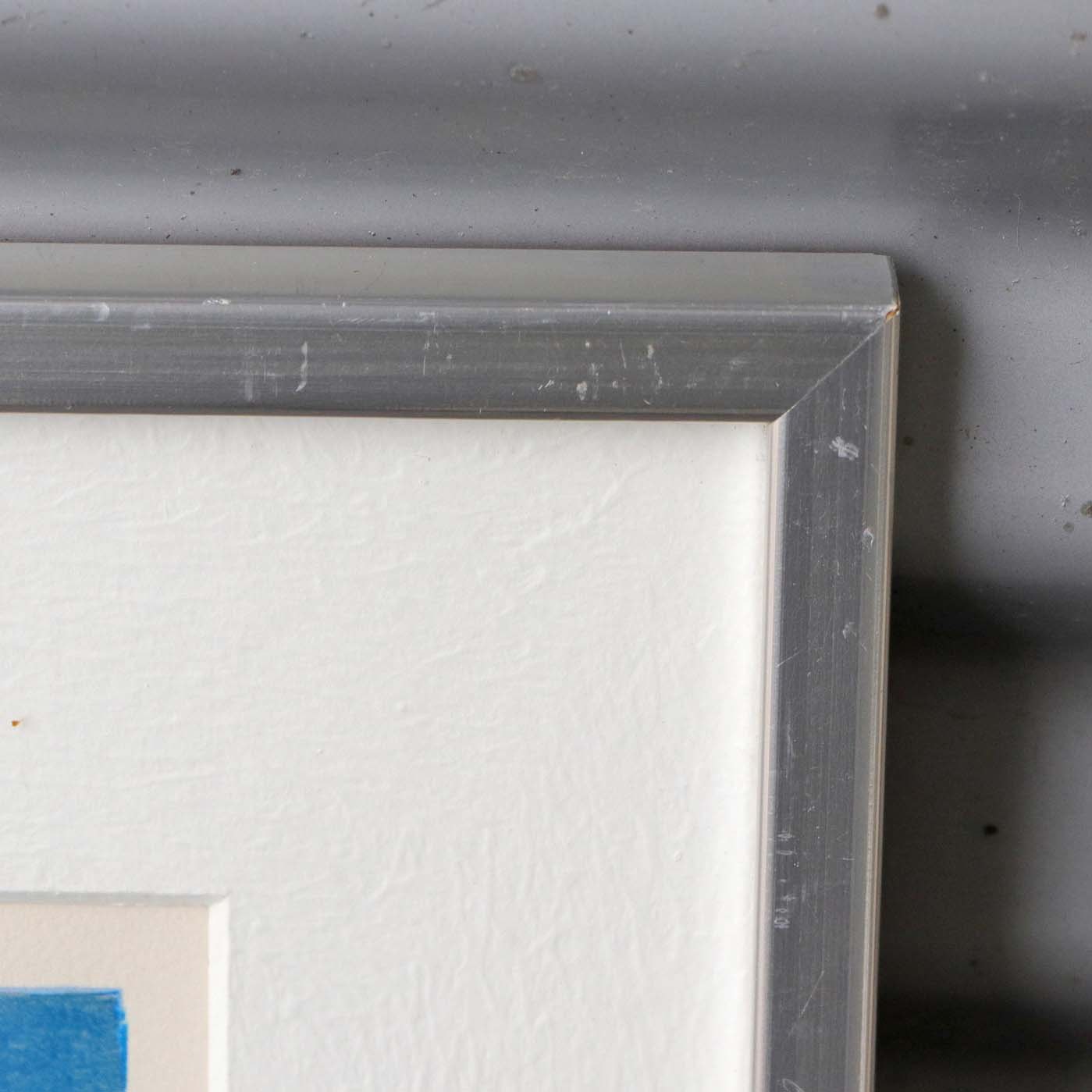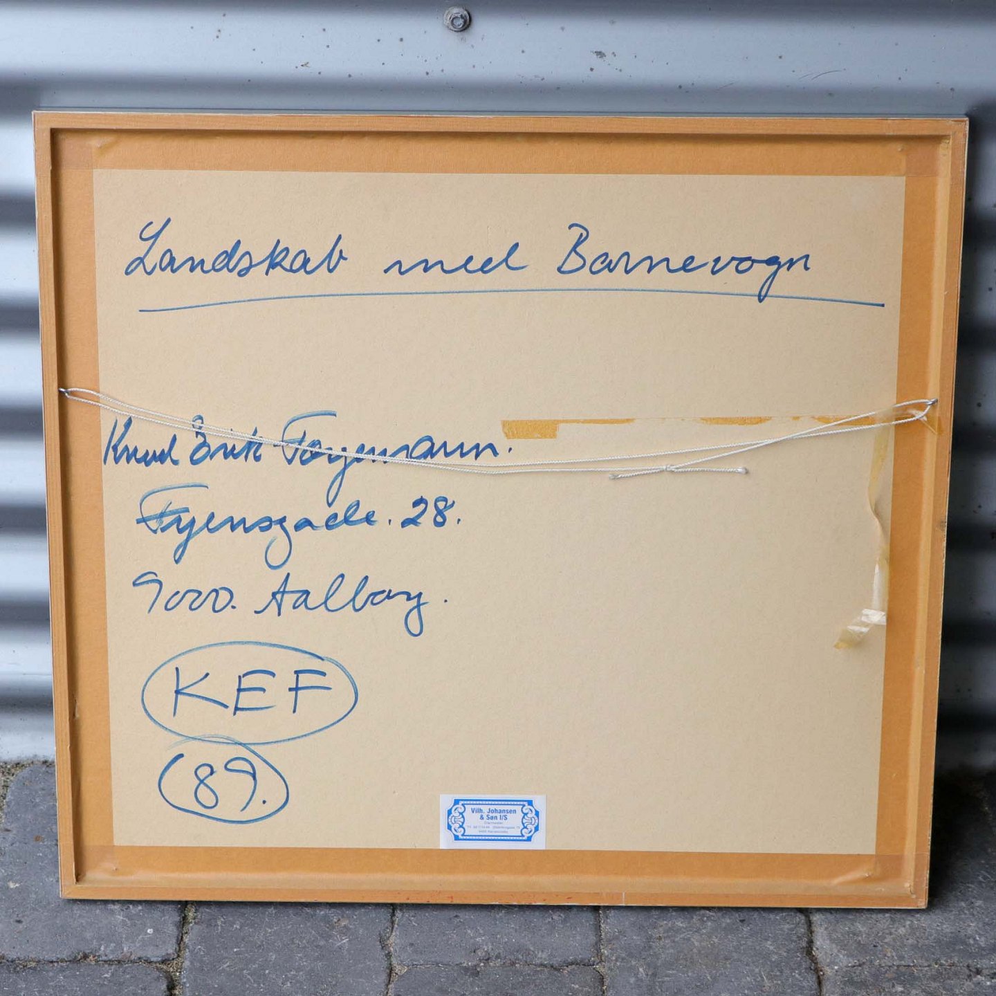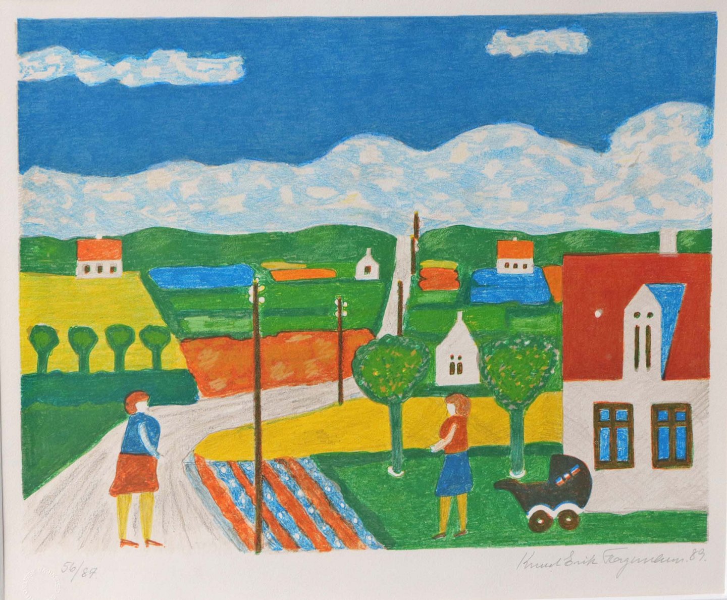 Indrammet litografi i passepartout med sølvmalet ramme. Litografisk tryk nr. 56/87 fra år 1989 med titlen Landskab med barnevogn, hvor motivet viser to kvinder i landsbyområde.
