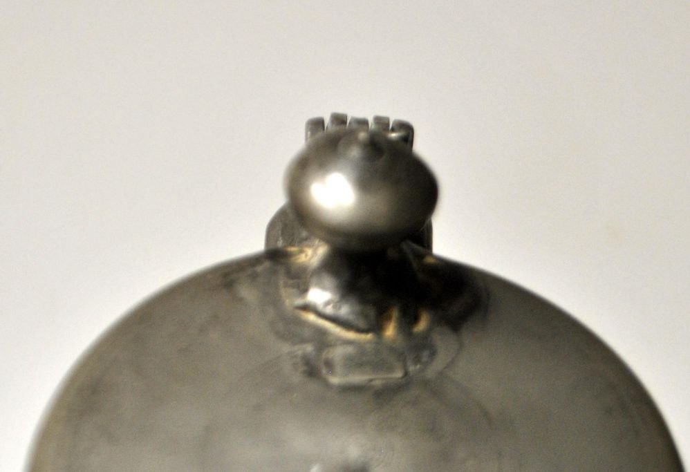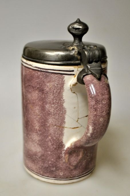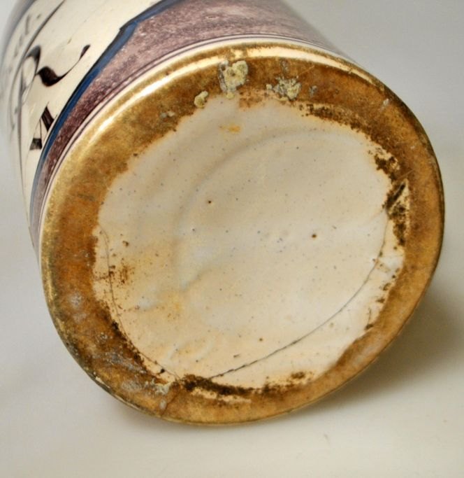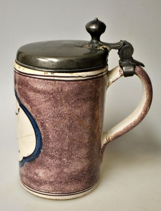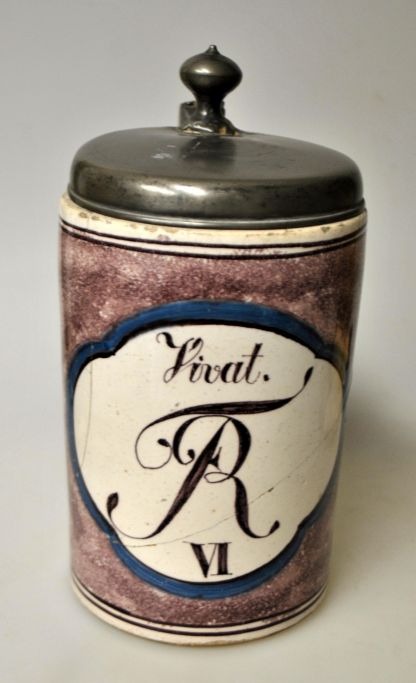 Hannoversch-Münden Fajance Valse krus, 1808 - 1839. Tyskland. Forside dekoreret med tekstenfor den danske konge: Vivat Fr. VI. Dekoreret i mangan, sort og blåt. Tinlåg med gæk uden dekoration. Usigneret. Låget er utydeligt stemplet.  Højde.: 15 cm.