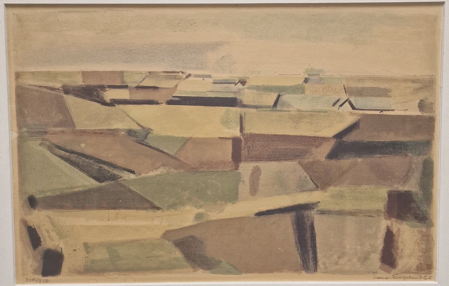 Indrammet Litografisk tryk med motiv af marker. Nr 350/350