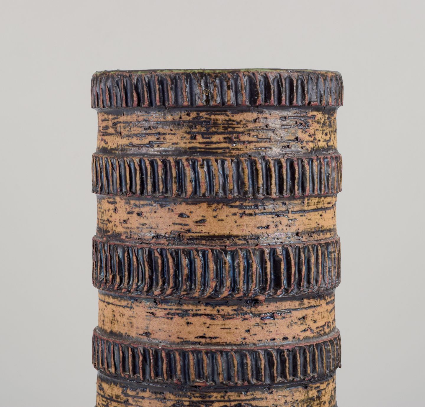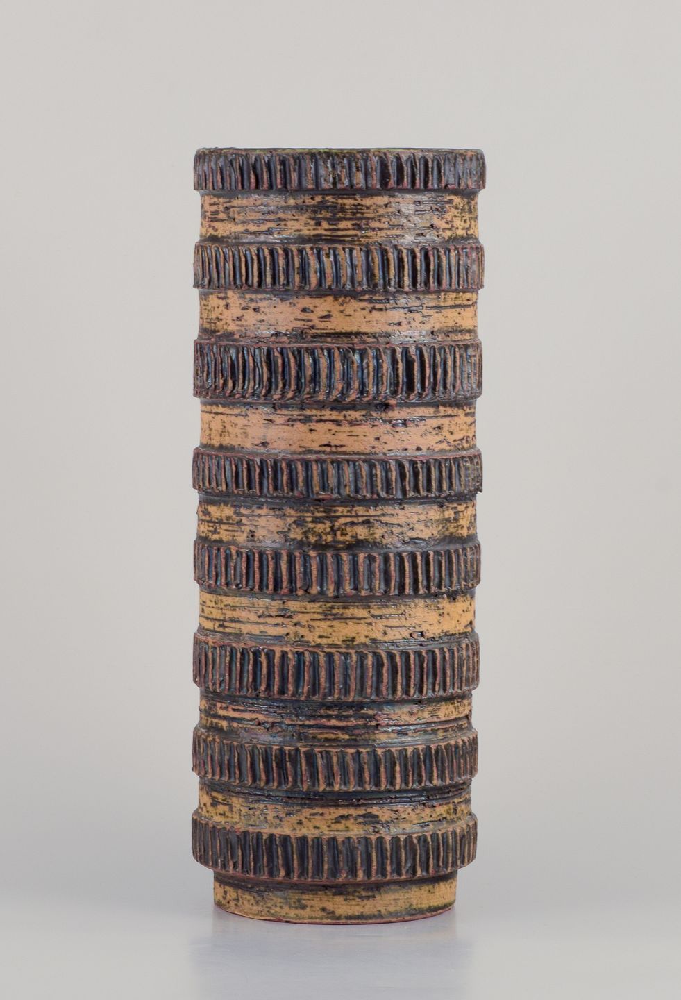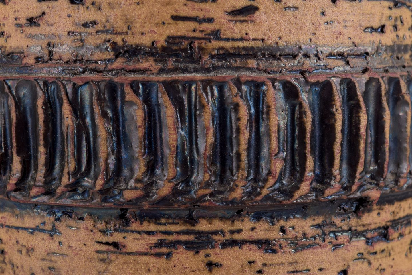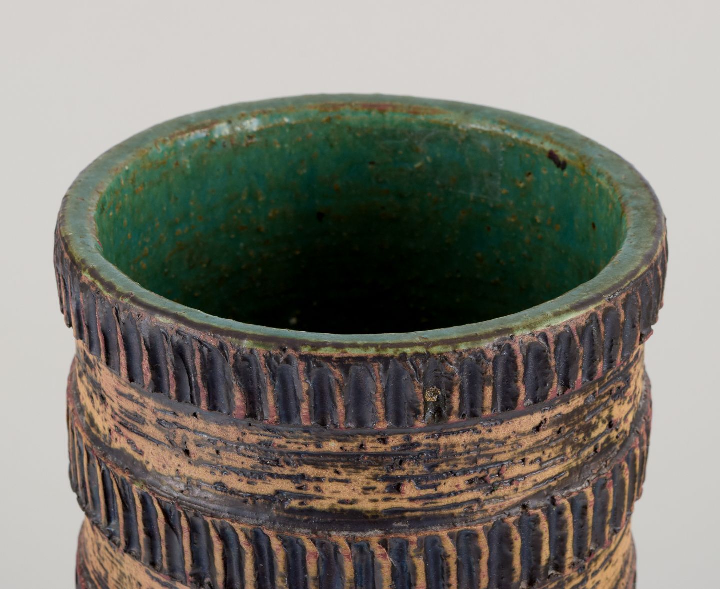 Håndglaseret. Glasur i okkergule og mørkebrune toner, indvendigt med grøn glasur.