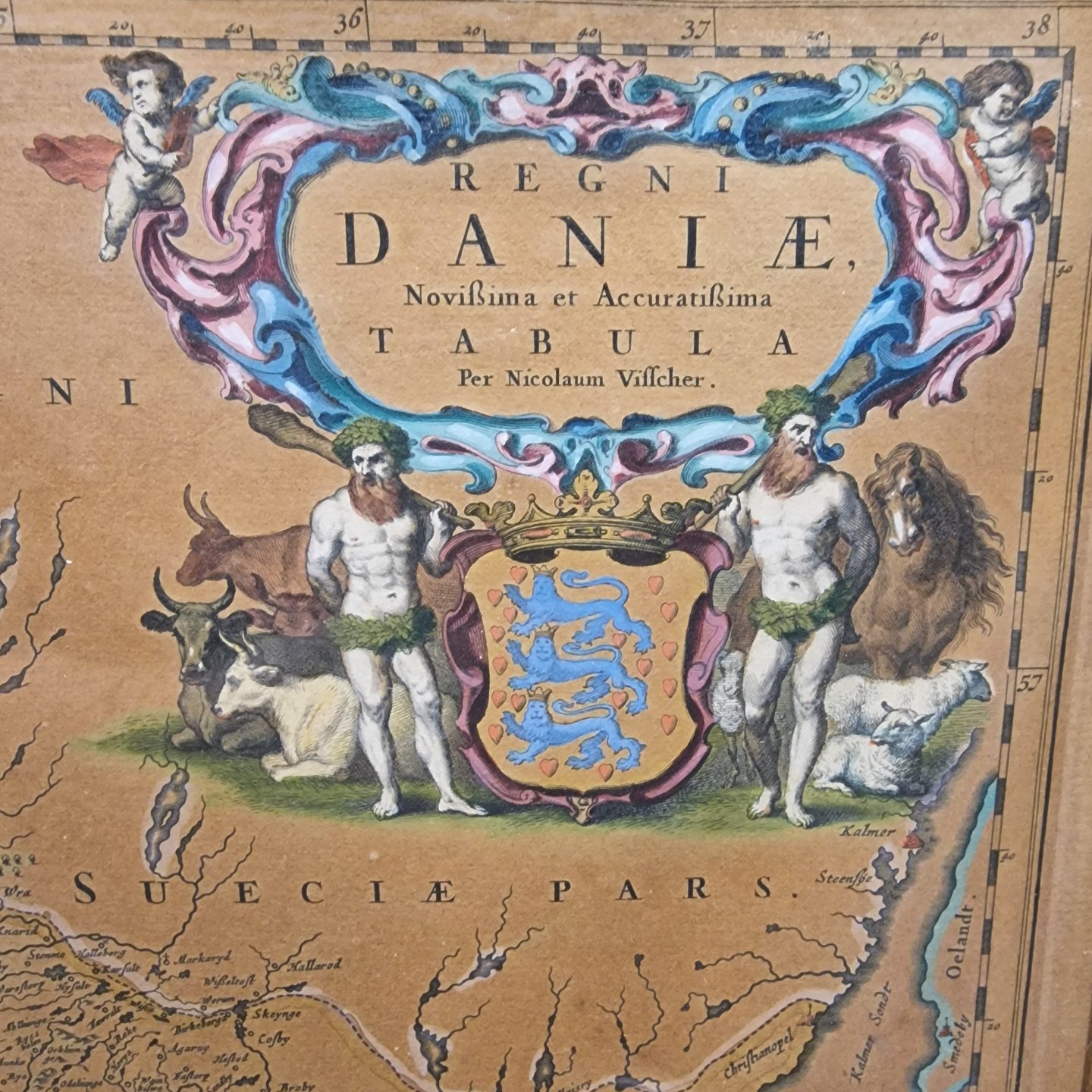 Danmarkskort fra før 1900 tallet. Bogtryk som er blevet koloreret. Bogtrykket er i ramme med glas