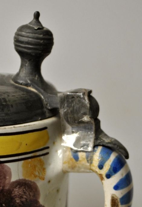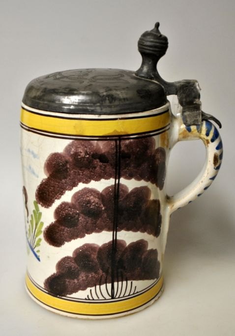 Hannoversch-Münden Fajance Valse krus, ca. 1810. Tyskland. Forside dekoreret med springende hest. Dekoreret i gul, blå, grønt og mangan. Stemplet i bunden: Med tre halvmåner. Tinlåg med gæk med dekoration og bogstaverne: A.D.M. Låget er stemplet:KM. Højde.: 18 cm.
