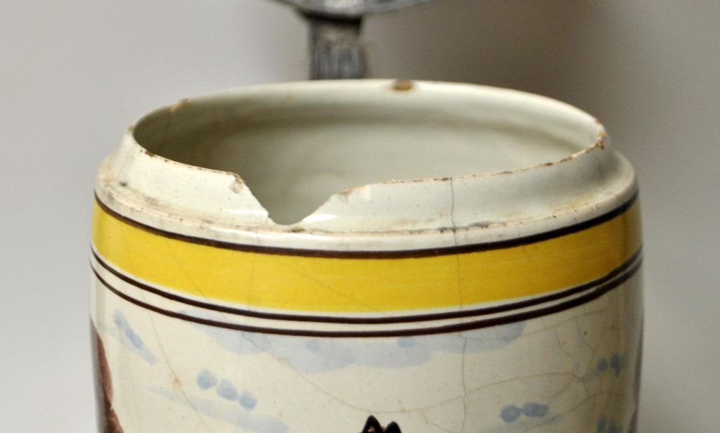 Kruset har flere hårrevner og et afslag på kanten. Låget sidder ikke fast med montering.