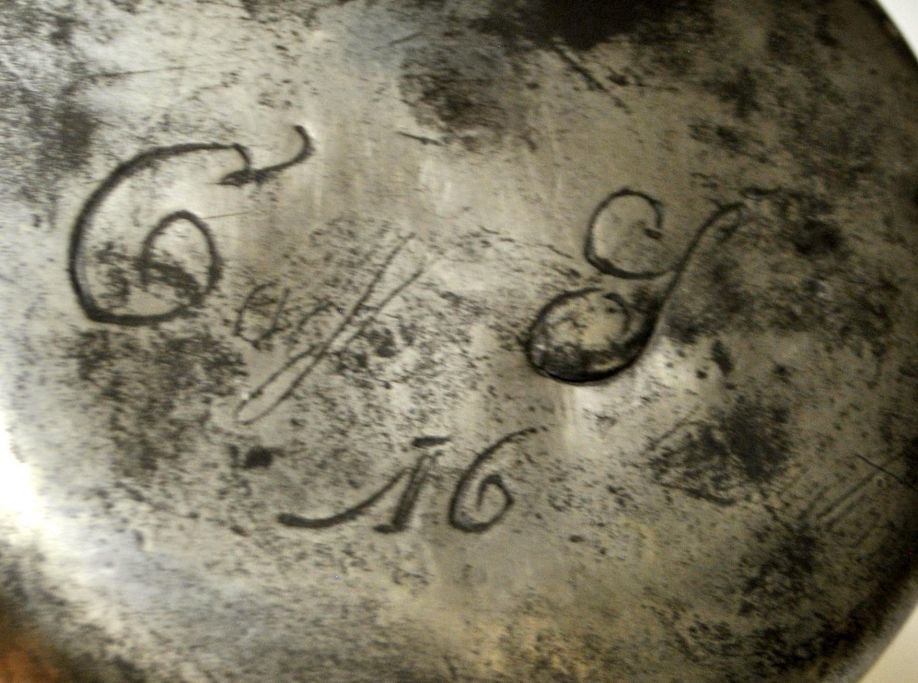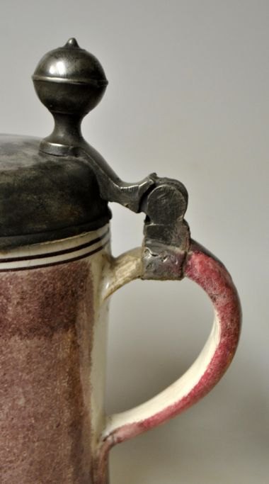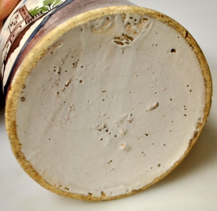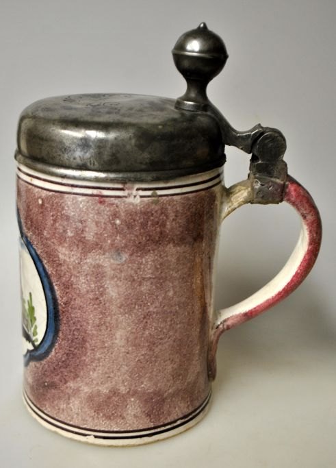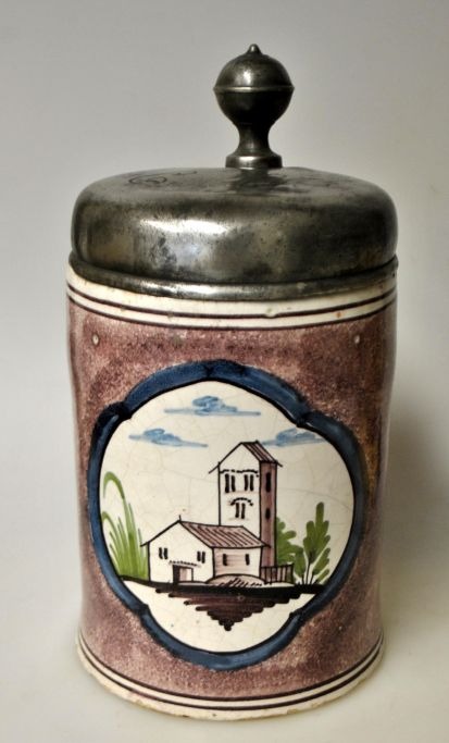 Hannoversch-Münden Fajance Valse krus, ca. 1830. Tyskland. Forside dekoreret med slot eller kirke. Dekoreret i mangan, sort, grønt og blåt. Ustemplet. Tinlåg med gæk med intialerne: C.S 16. Usigneret. Låget er stemplet med nøgle. Højde.: 16 cm.