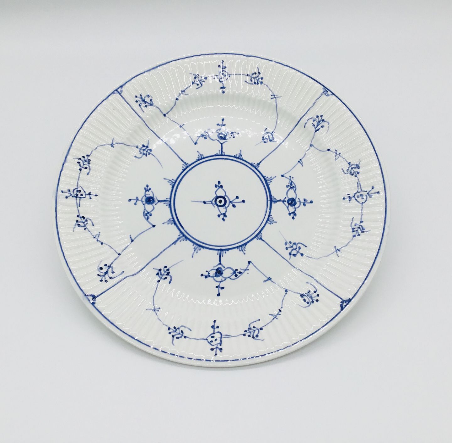 Aluminia Musselmalet, produceret 1870-1920 uden krakelering og i hel og fin stand, ubetydelige brugsspor. Middag 25 cm, Frokost 21,5 cm, Lille dyb 21,5 cm, Stor dyb 24 cm. Spørg efter antal.
