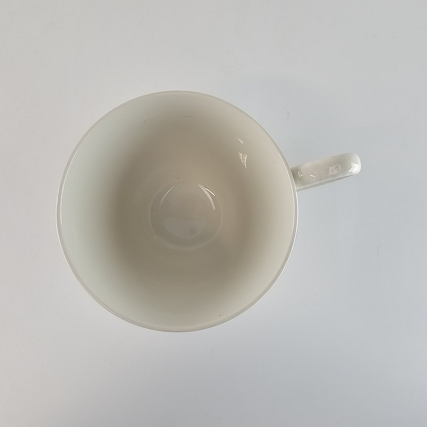 Text available in Danish: Kaffekop og underkop i fajance fra stellet Blå Eld nr. 582