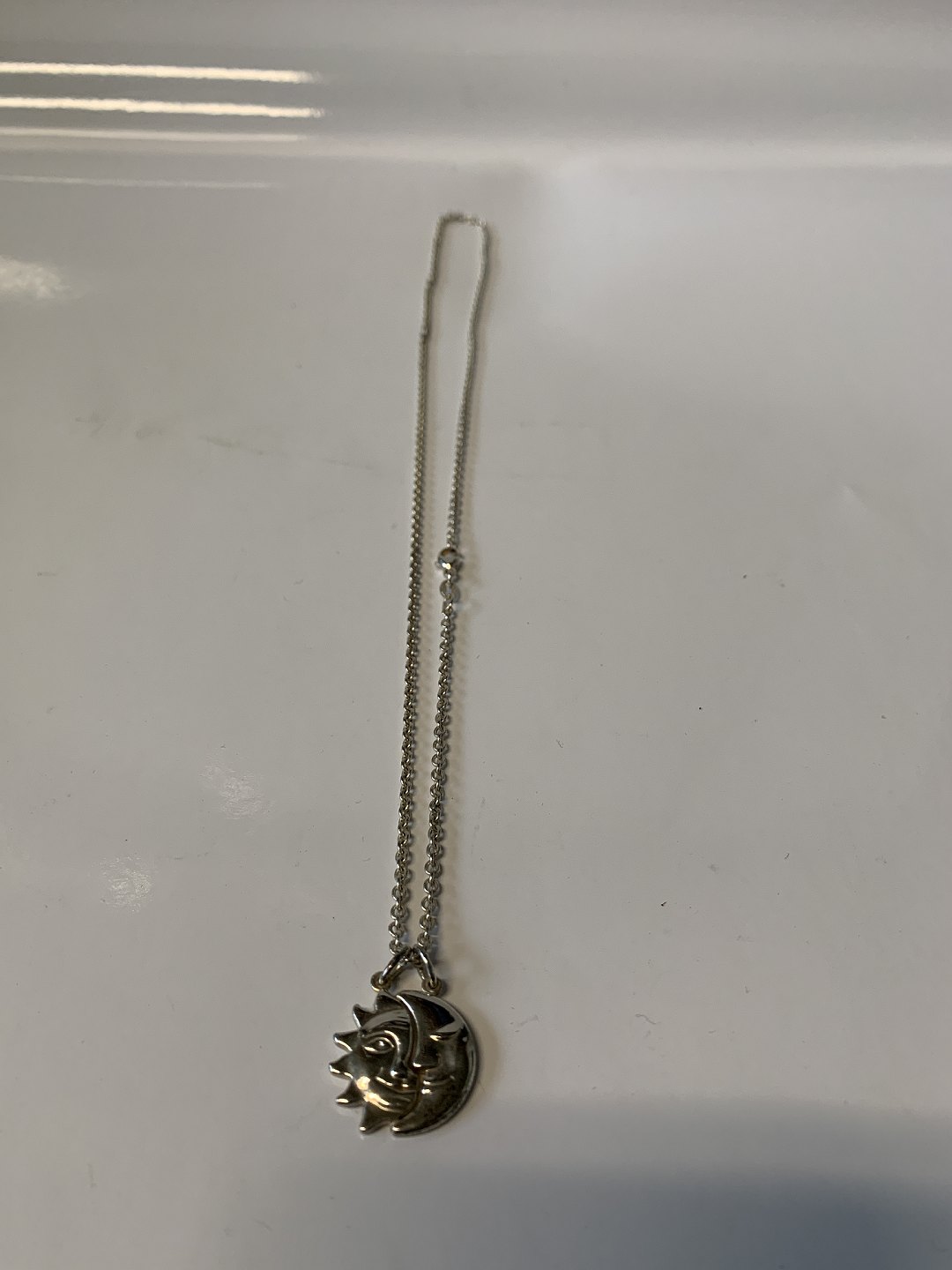 The pendant is designed with a crescent moon and sun. It is a beautiful piece of jewelery that suits both everyday life and parties.