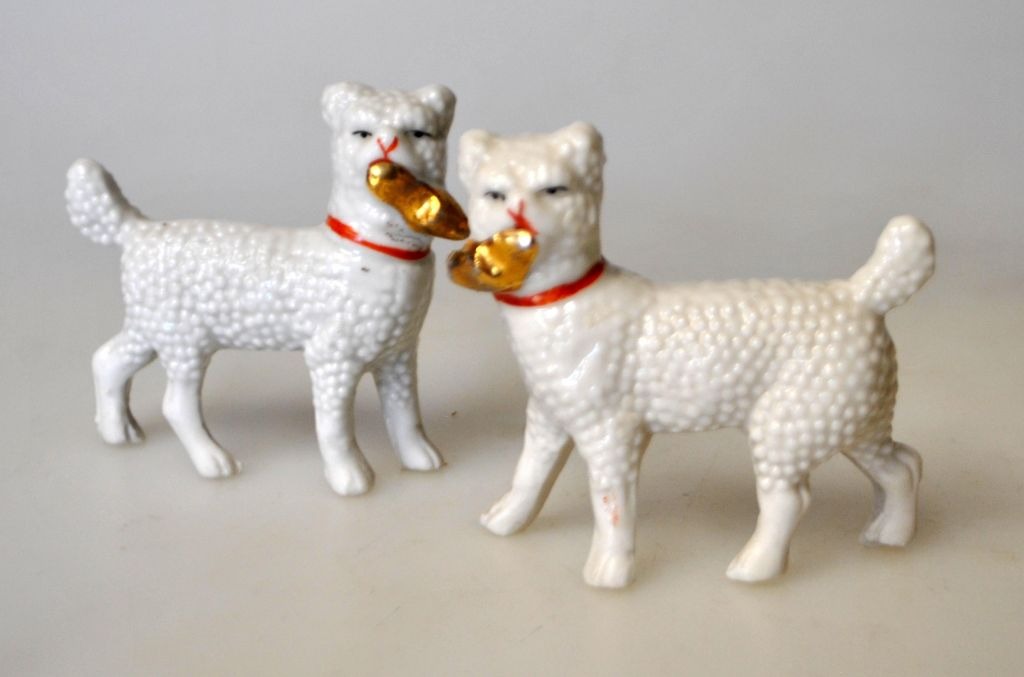 To porcelains hunde, 19. årh. Tyskland. Holder hver sin sko. Forgyldning på sko og bemalet. H: 6 cm. L: 6 cm