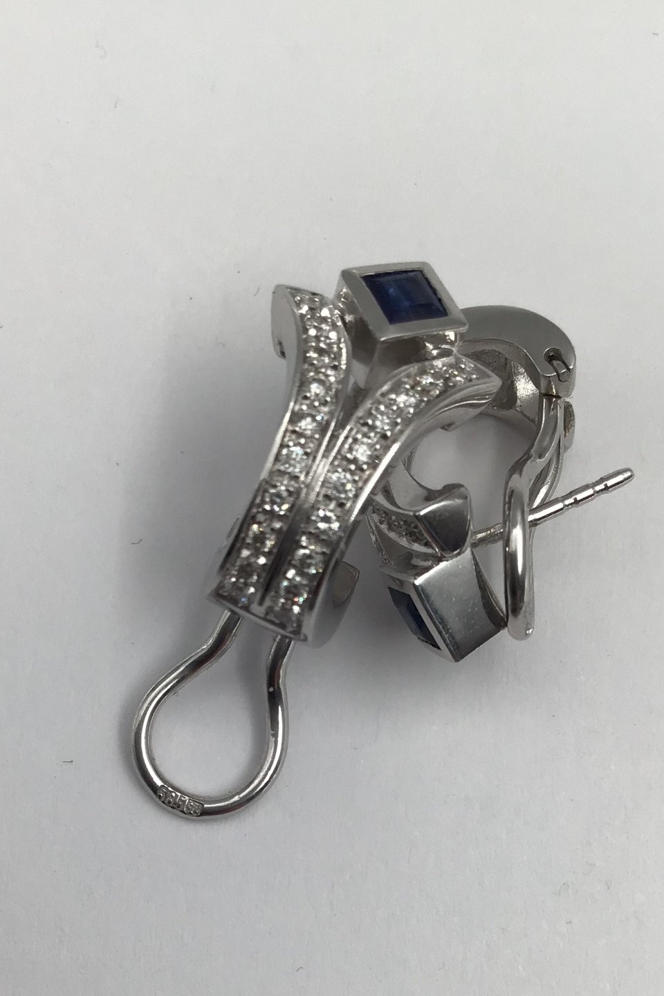Danish 14 K Whitegold Ear Studs w Saphir & Diamonds Measures 2 cm x 1.2 cm (0.78 inch x 0.47 inch) Combined Weight 9.3 gr (0.33 oz)