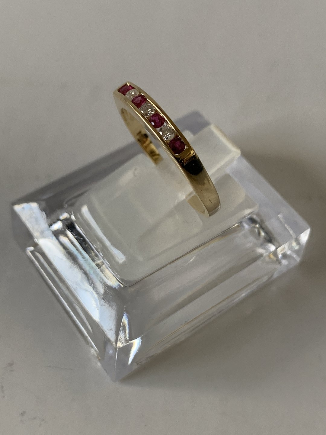 Alliancering i 14 karat guld, med indlagte rubiner og brillanter. Størrelse. 57