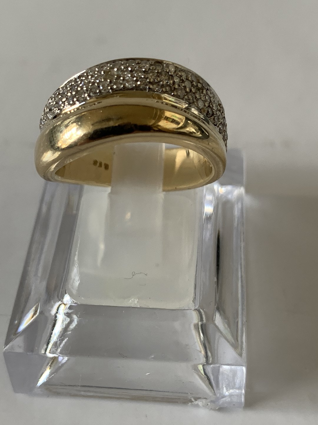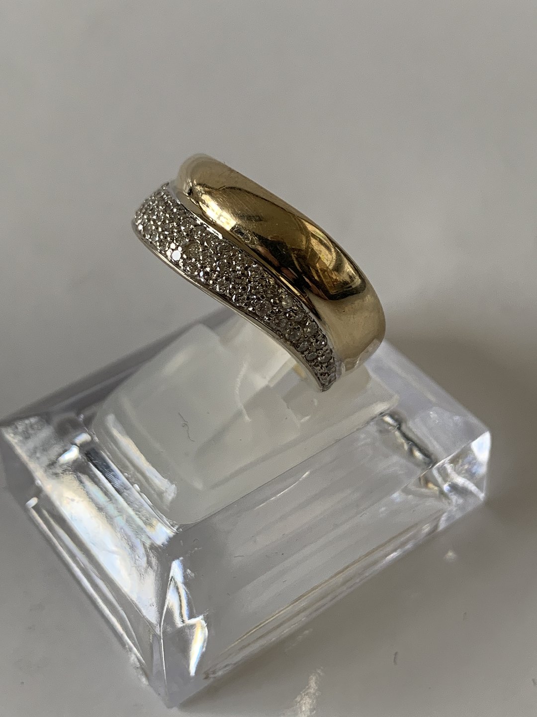 Flot og elegant damering i guld, og med flotte bløde former. Der giver ringen en flot levende look. De indlagte brillanter, giver ringen et enormt liv. Ringen kan bruges til både hverdag og fest, hvor den kan anvendes alene eller i kombination med andre ringe.