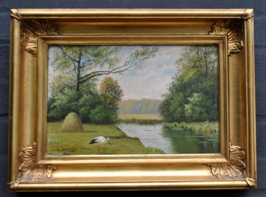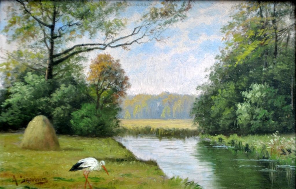 Jacobsen, A (19. årh.) Danmark: En stork ved en å. Olie på malerplade. Signeret. 21 x 31 cm.
