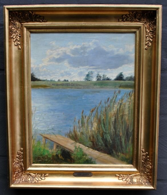 Soya-Jensen, Carl Martin (1860 - 1912) Danmark: Landskab med sø og bro. Olie på lærred. Signeret. 33 x 41 vm.