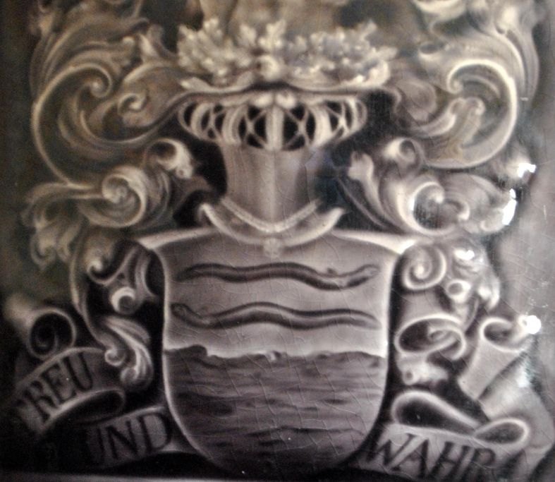 Porcelæns plaquette/kakel med våbenskjold, 19. årh. Tyskland. Våbenskjold med vildmand. Selve skjoldet med to ål og hav og teksten: Treu und Wahr. 31,5 x 21 cm.
