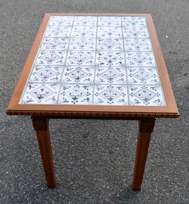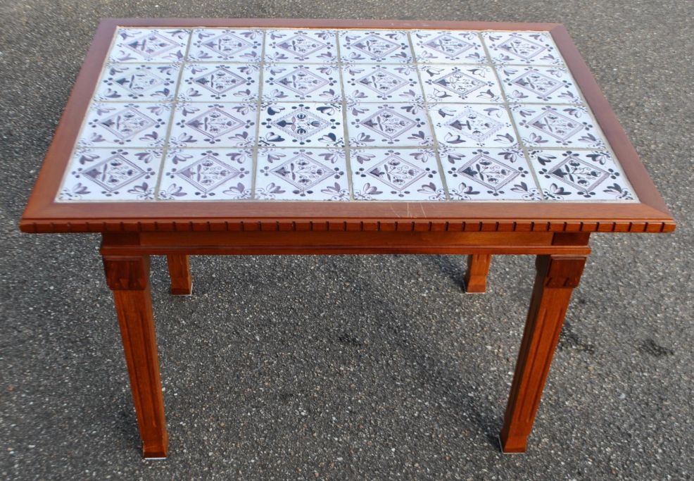 Dansk mahogni flisebord, 20. årh. Med 24 manganfarvede fliser fra 2. halvdel af 1700-tallet. Blomst i kvadrat. Fliserne er 13 x 13 cm. Bordet er udarbejdet af dansk snedker. B.: 62 cm. H.: 60 cm. L.: 89 cm. Med tandsnit på bordkant og kannellerede ben.