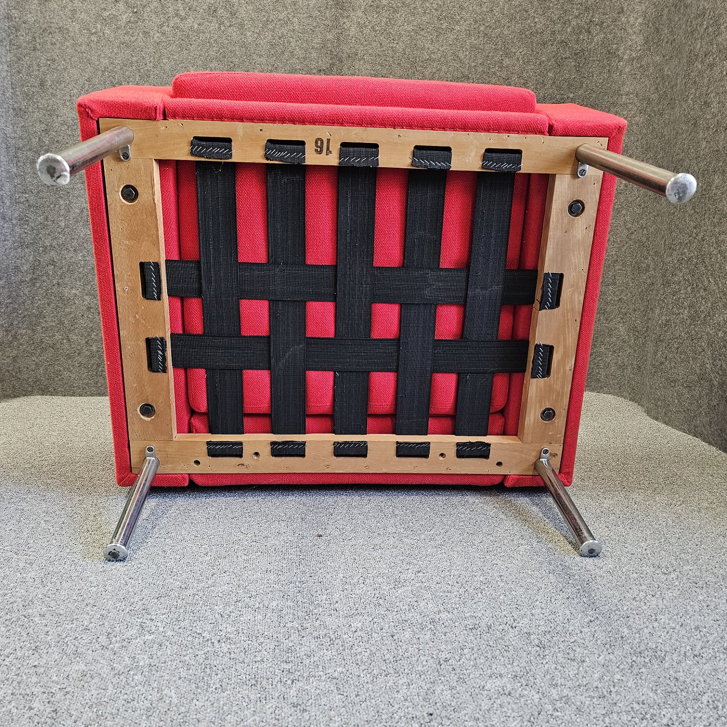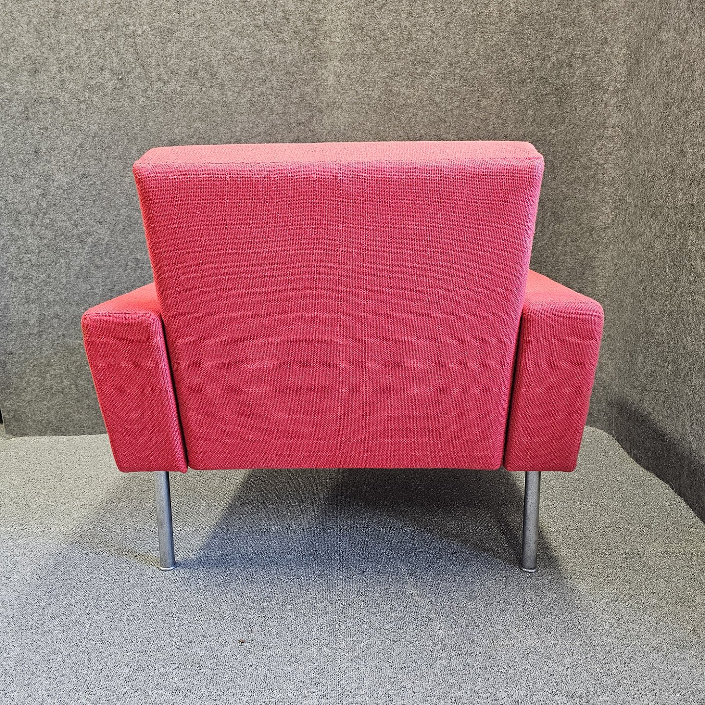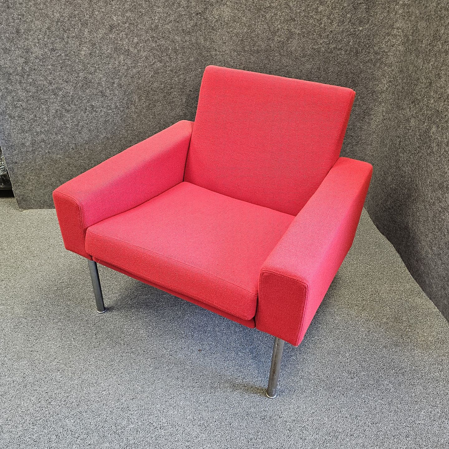Text available in Danish: Lænestol model AP 34/1 også kendt som luftshavnsstolen. Stolen er betrukket med rødt uldstof samt har ben af metal.