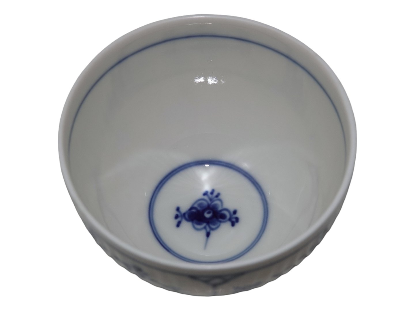 Royal Copenhagen Musselmalet Riflet, lille rund skål med bemaling inde i.