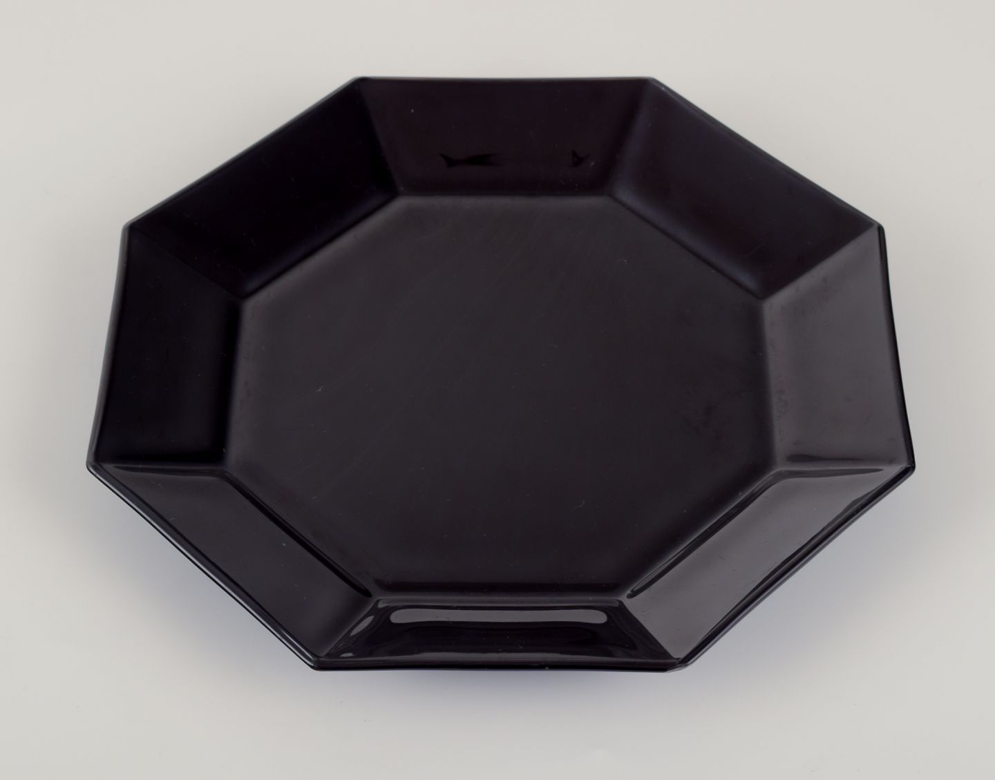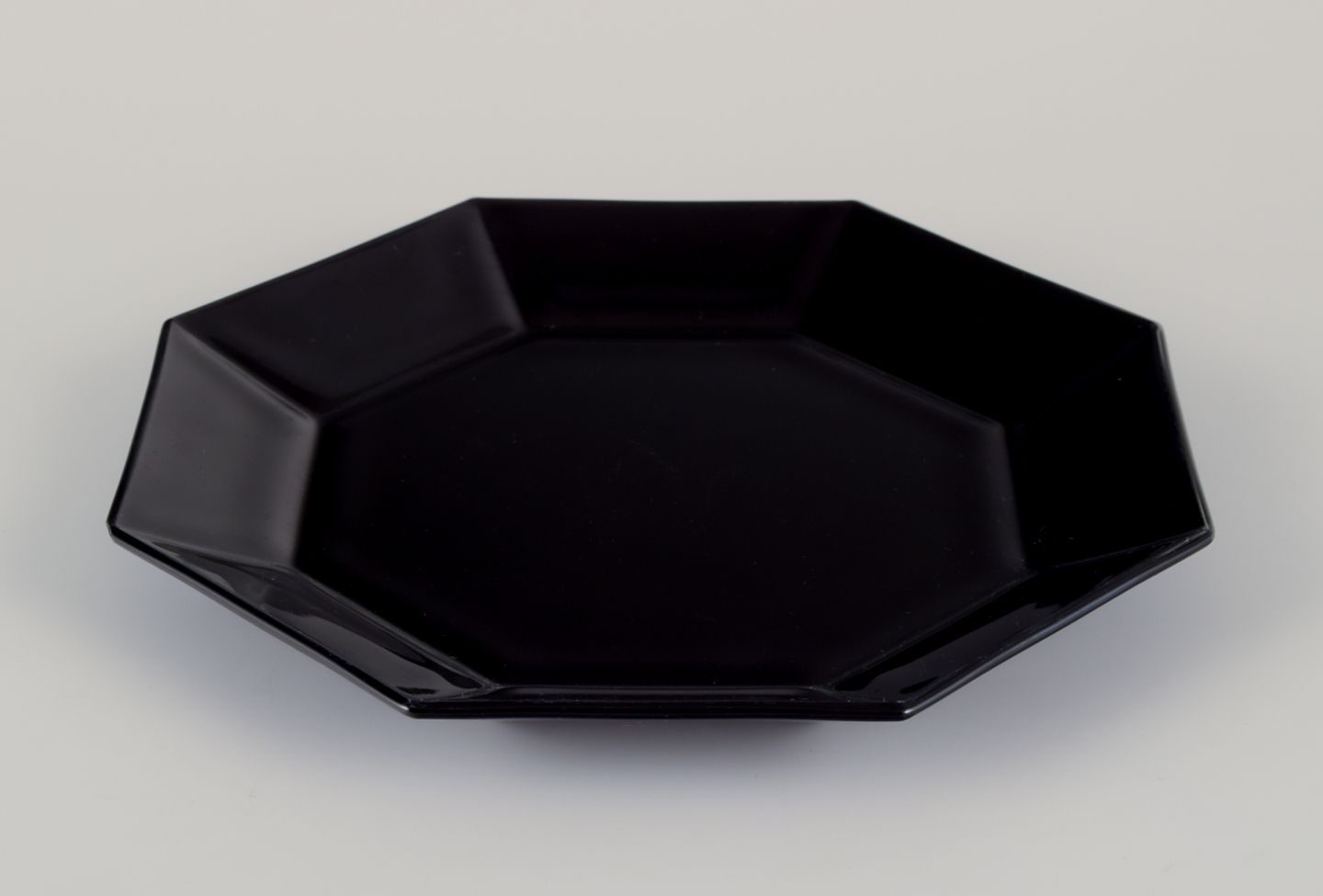 Et sæt på ni ottekantede tallerkner i sort glas.